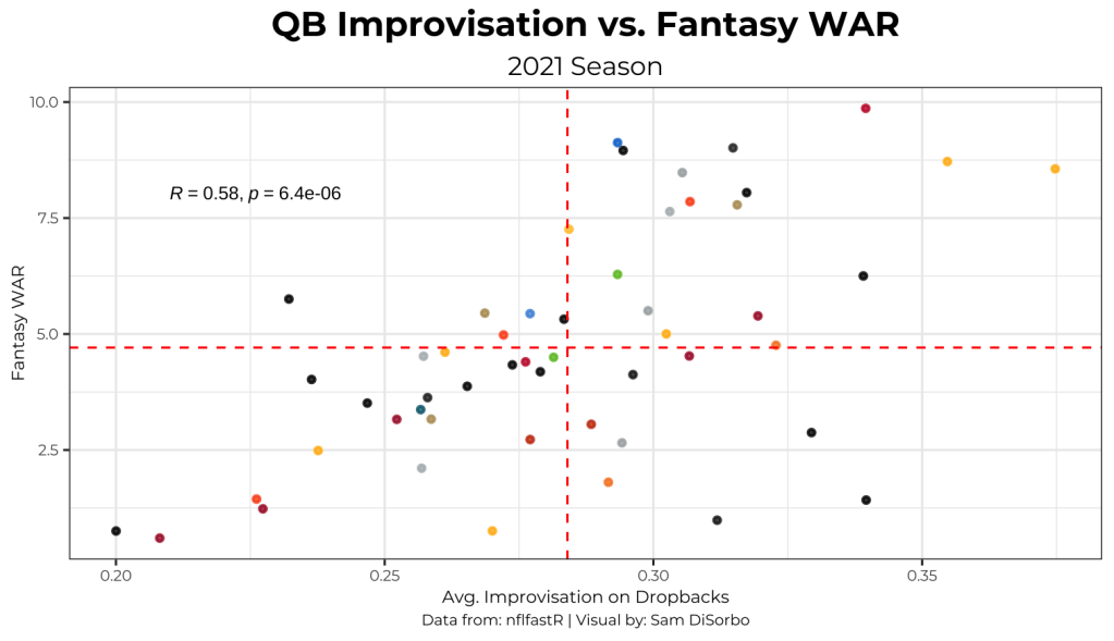 When we remove dropbacks where QBs scramble, the results are even stronger. We see below that 53% of the variance in fantasy WAR is described by the variation in QB improvisations on pass attempts.