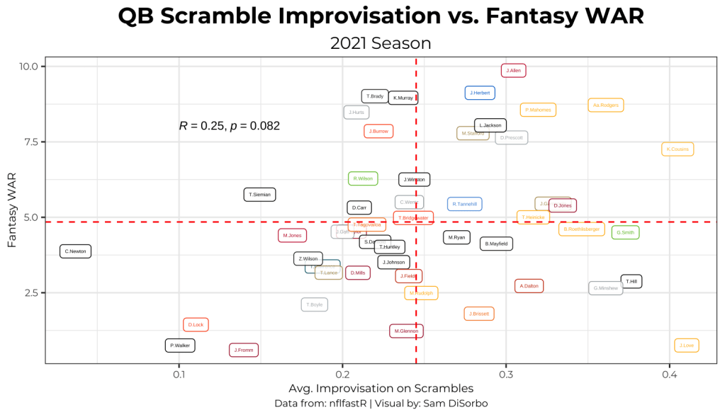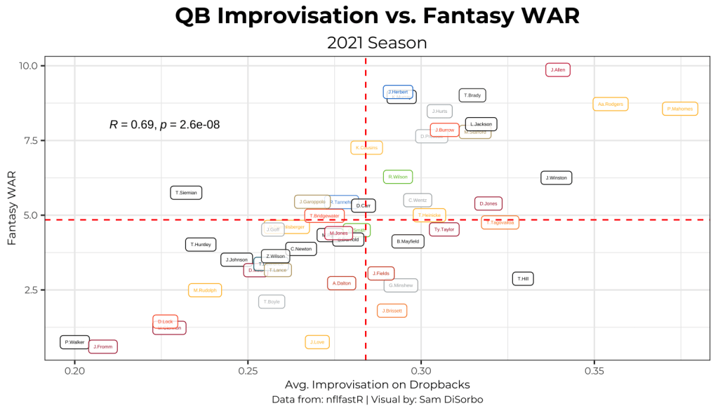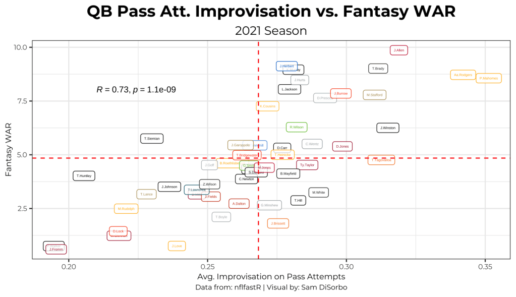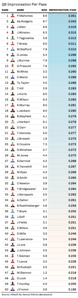 Now that we see how important QB improvisation per pass attempt is, we can take a look at the improvisation rankings from 2021.