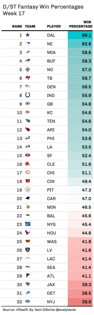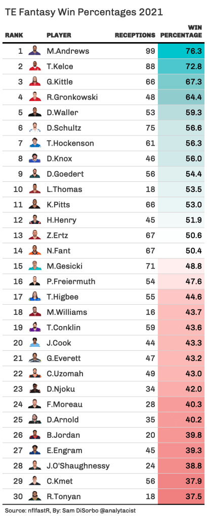 Next, one of the most telling fantasy statistics, win percentage. This metric is used to calculate WAR (wins above replacement), but win percentage (FWP) is simply easier to understand. It tells us what percent chance you would have to win on average if you had said player on your team while the rest of your team and the team your were against was average. For example, owners with Jonathan Taylor on their team would have a 78.7% chance (on average) to win each week last season if the rest of their team was average and the team you were facing was average (or replacement level).