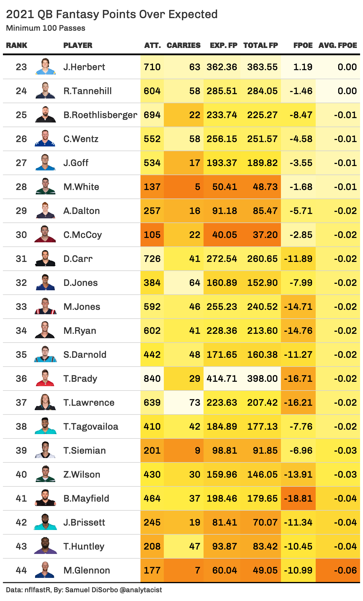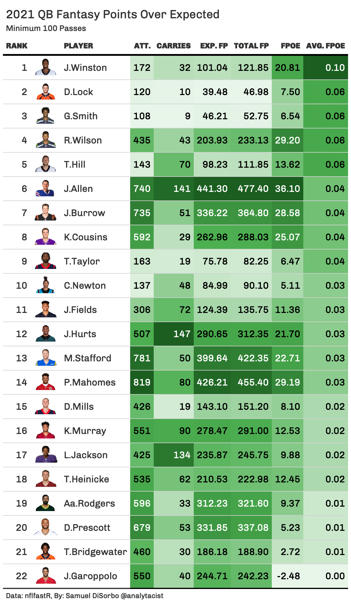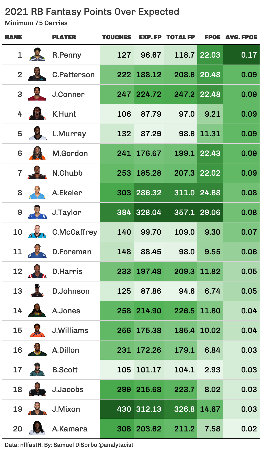 First off, we have fantasy points over expected (FPOE). The link to this full article can be found here.