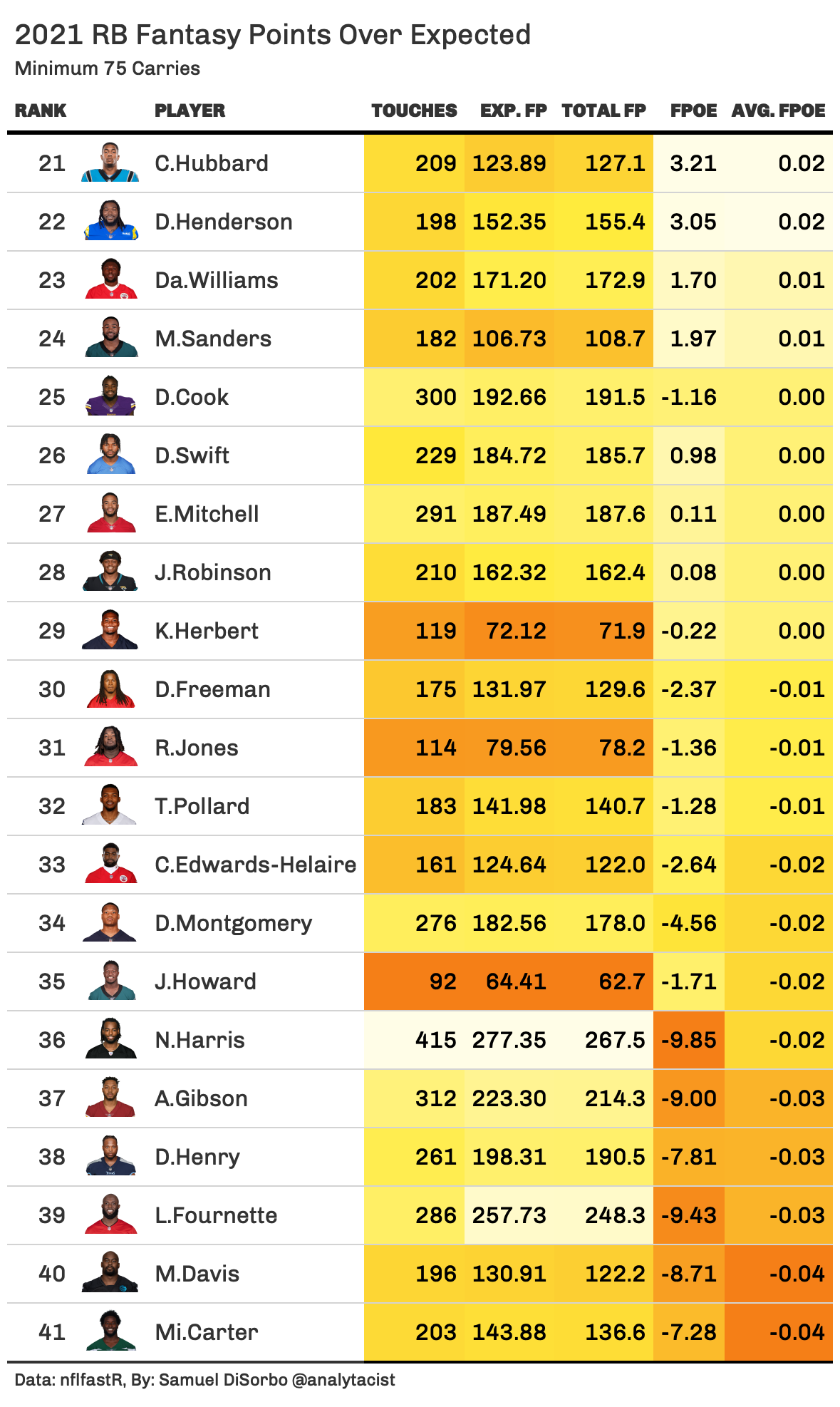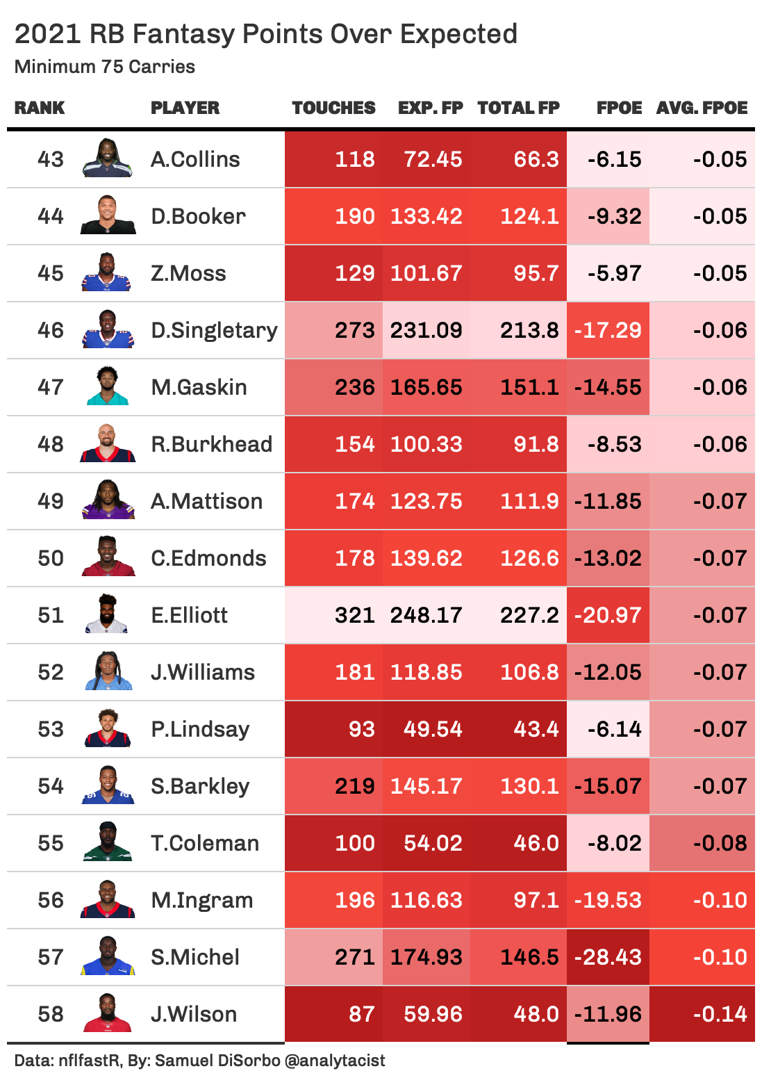 Next, we have the top 58 RBs in FPOE. Some backs to target: