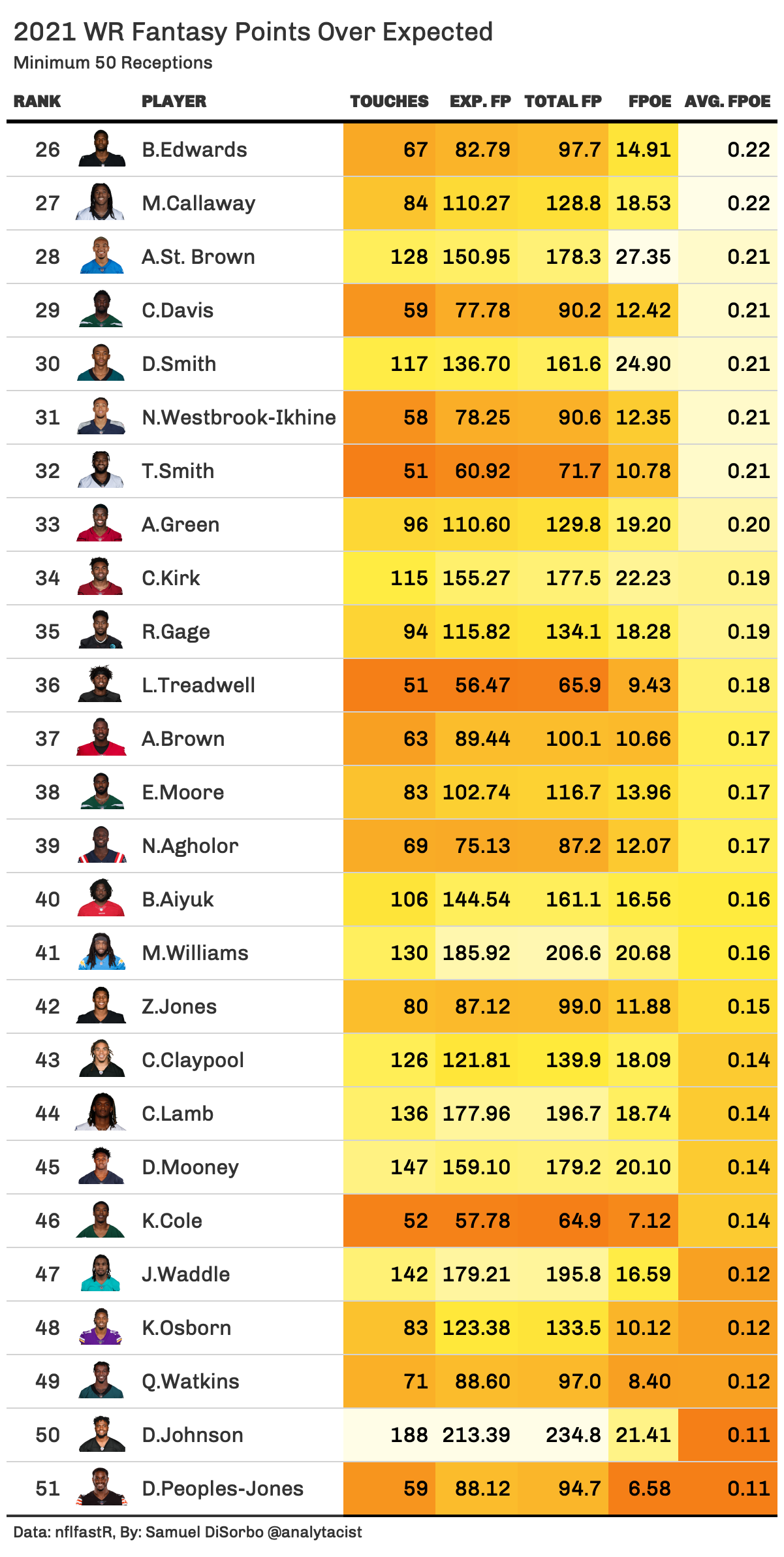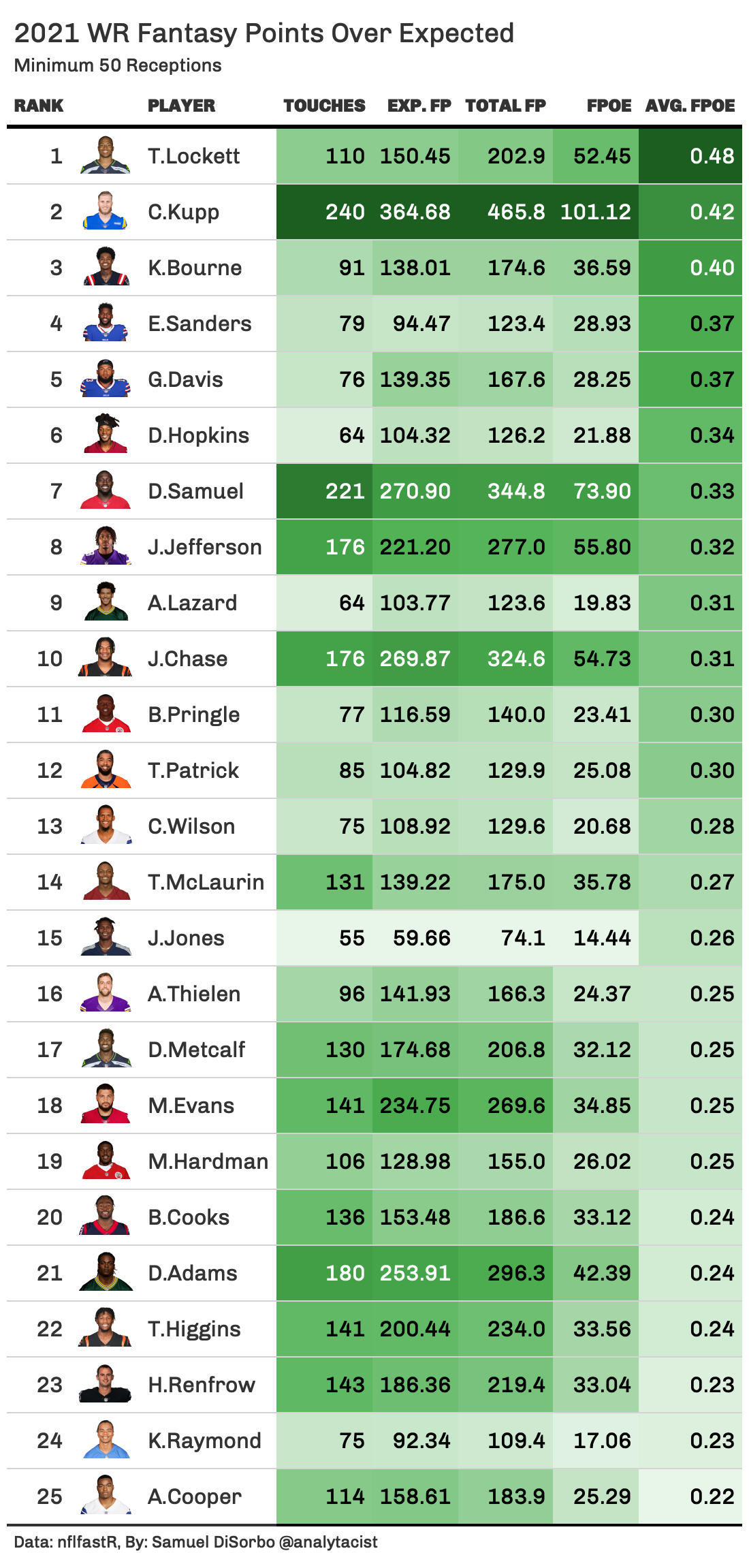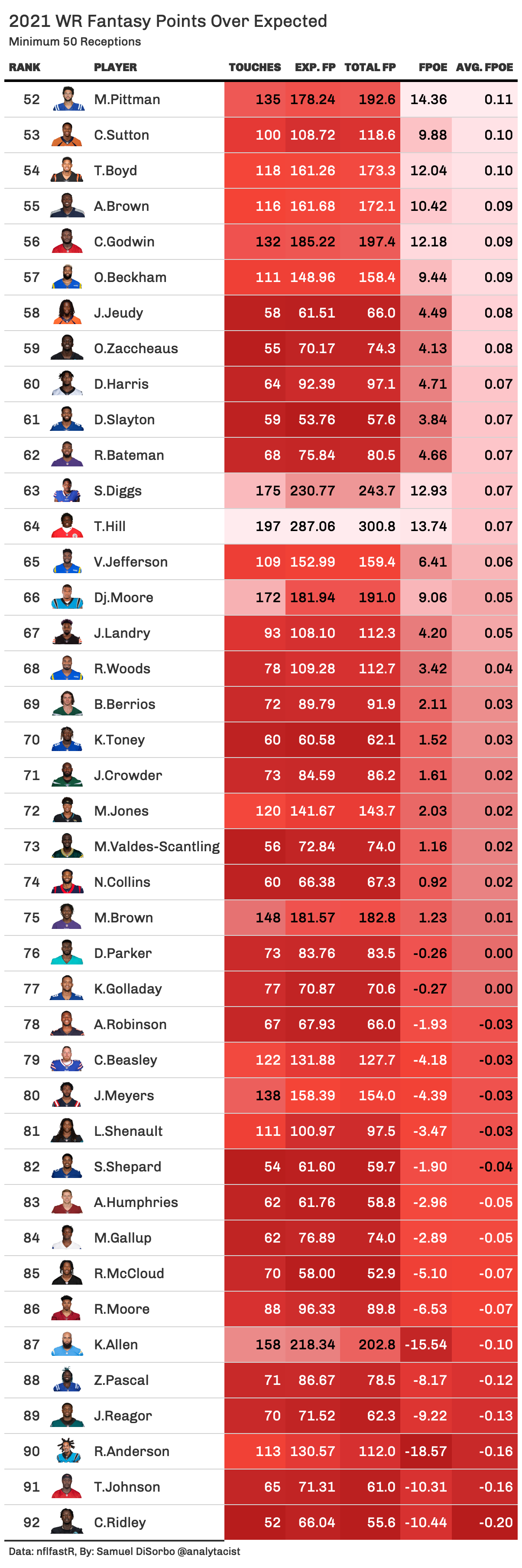 Next, let’s look at the top 92 WRs in average FPOE. Some WRs to target: