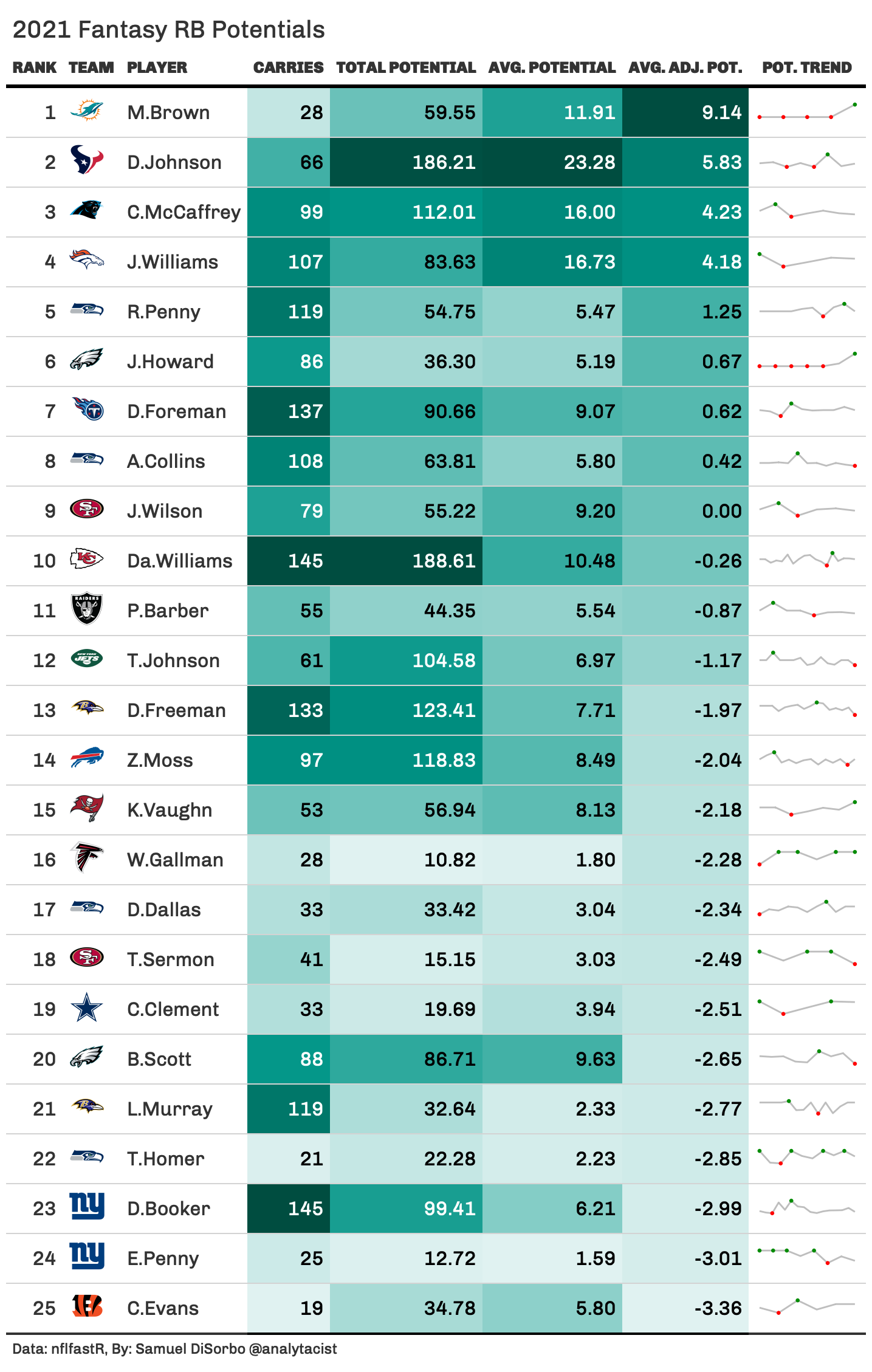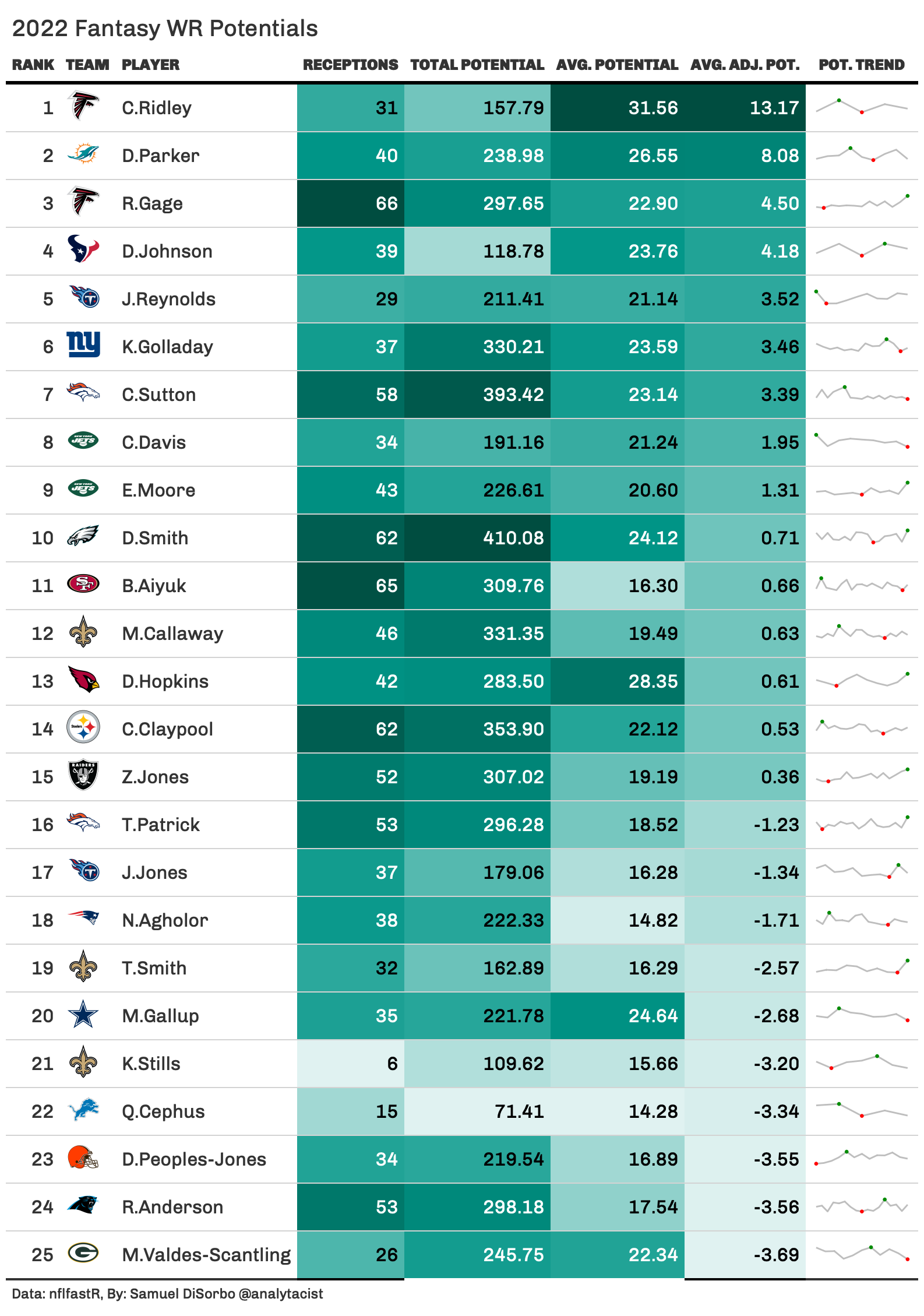 Last but not least, we will take a look at RB and WR potentials. This should give you an edge on finding players who have high potential to put up break out seasons in 2022 based on their 2021 performances/potentials. Read more about this metric here.