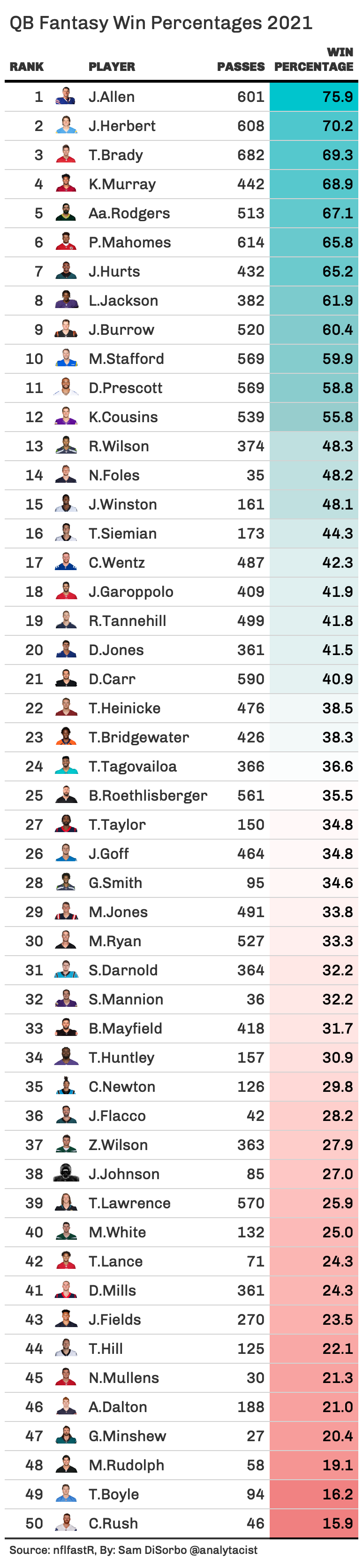 Below, we have our top 44 performing QBs in average FPOE (just because a QB ranks high in FPOE doesn’t mean they are always a good player to take). Some QBs to watch in your draft: