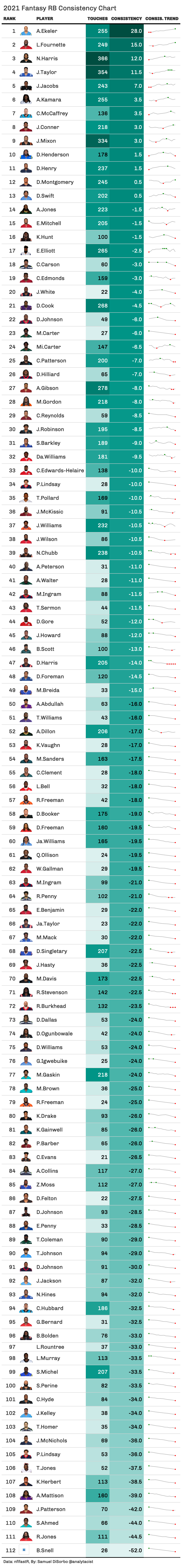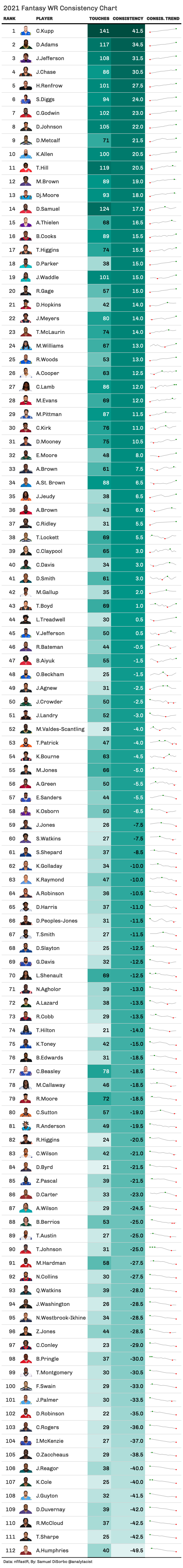 Next up, we will take a look at RB and WR consistencies. Consistencies close to or between -10 and 10 usually show inconsistency, while numbers higher than 10 show consistent over-performance, and vise versa shows consistent underperformance. Keep in mind, this doesn’t adjust ratings based on the number of carries you receive, so this metric will especially punish backs who don’t see many touches, which makes sense as they will likely not be consistent for you in fantasy. To read more about RB consistencies, click here. To read more about WR consistencies, click here.