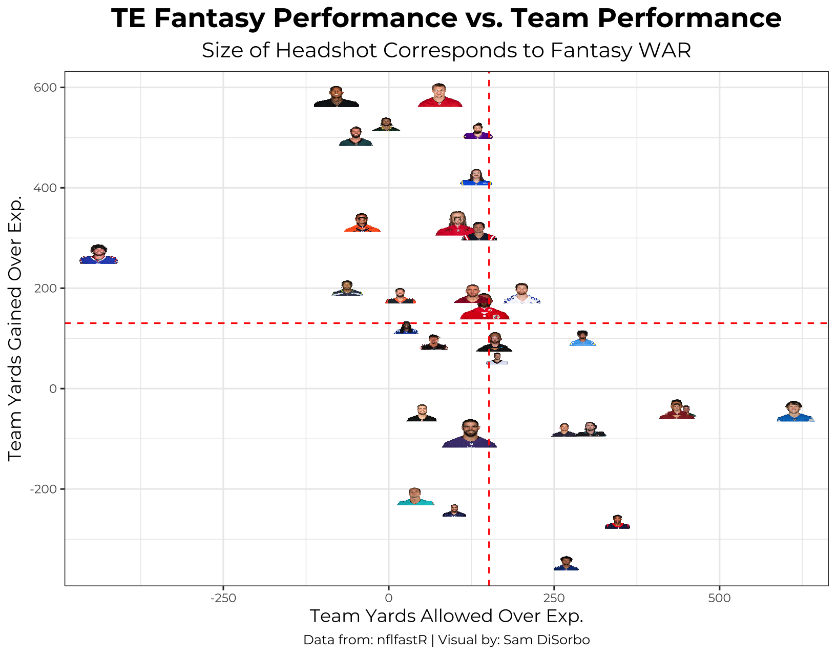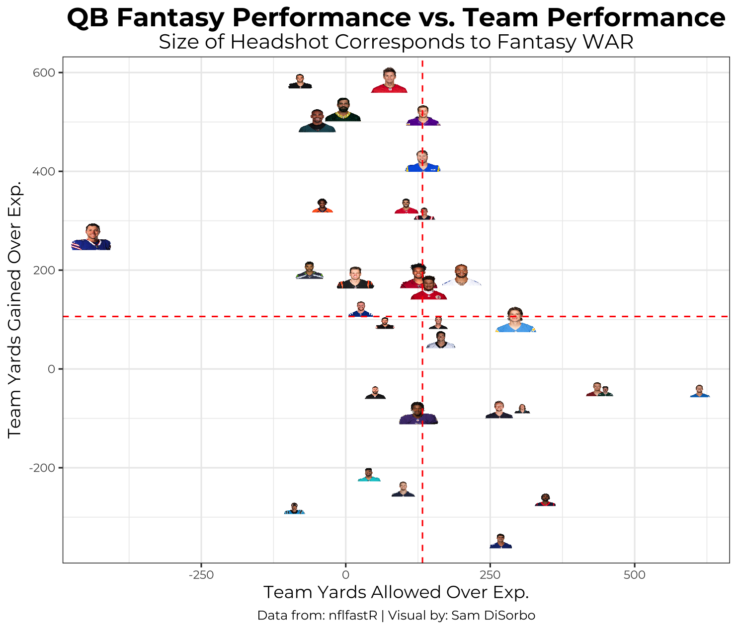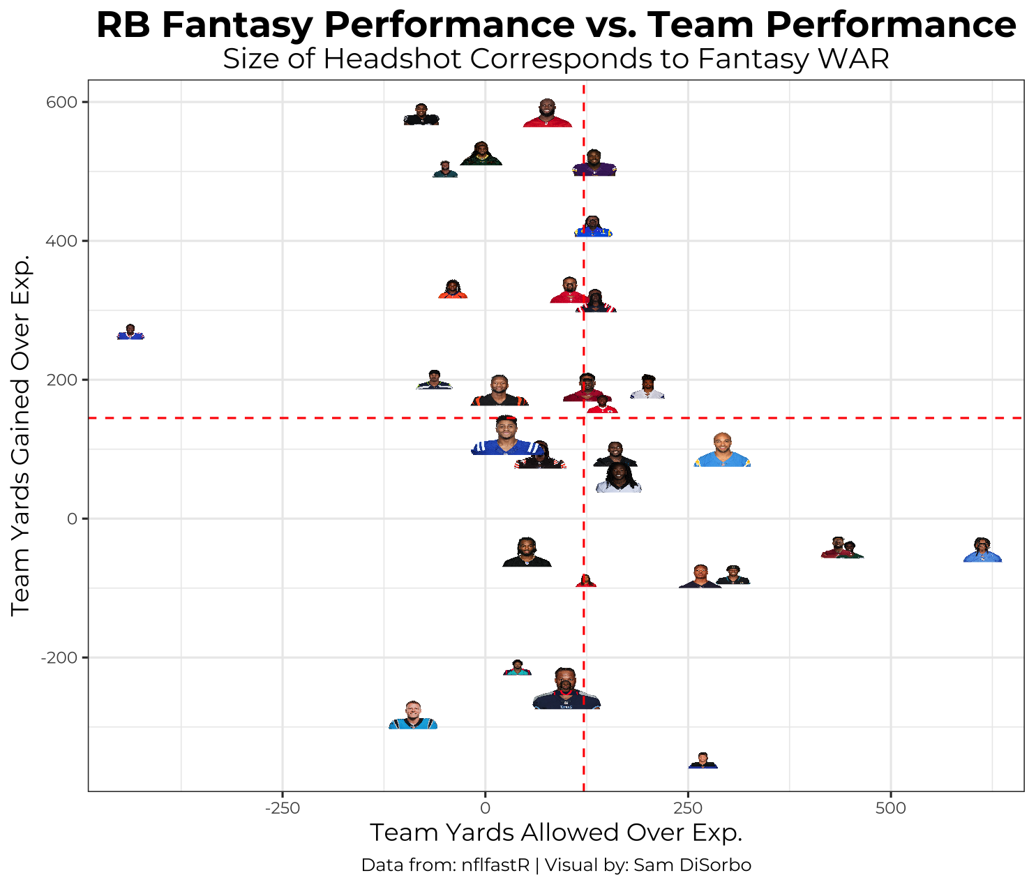 Below I plotted each key position by team yards gained over expected and allowed over expected. The size of each player’s headshot corresponds to their Fantasy WAR. To make things easier, the bottom right corner of each grid is where the worst teams lie (below average for YGOE and above average for YAOE).