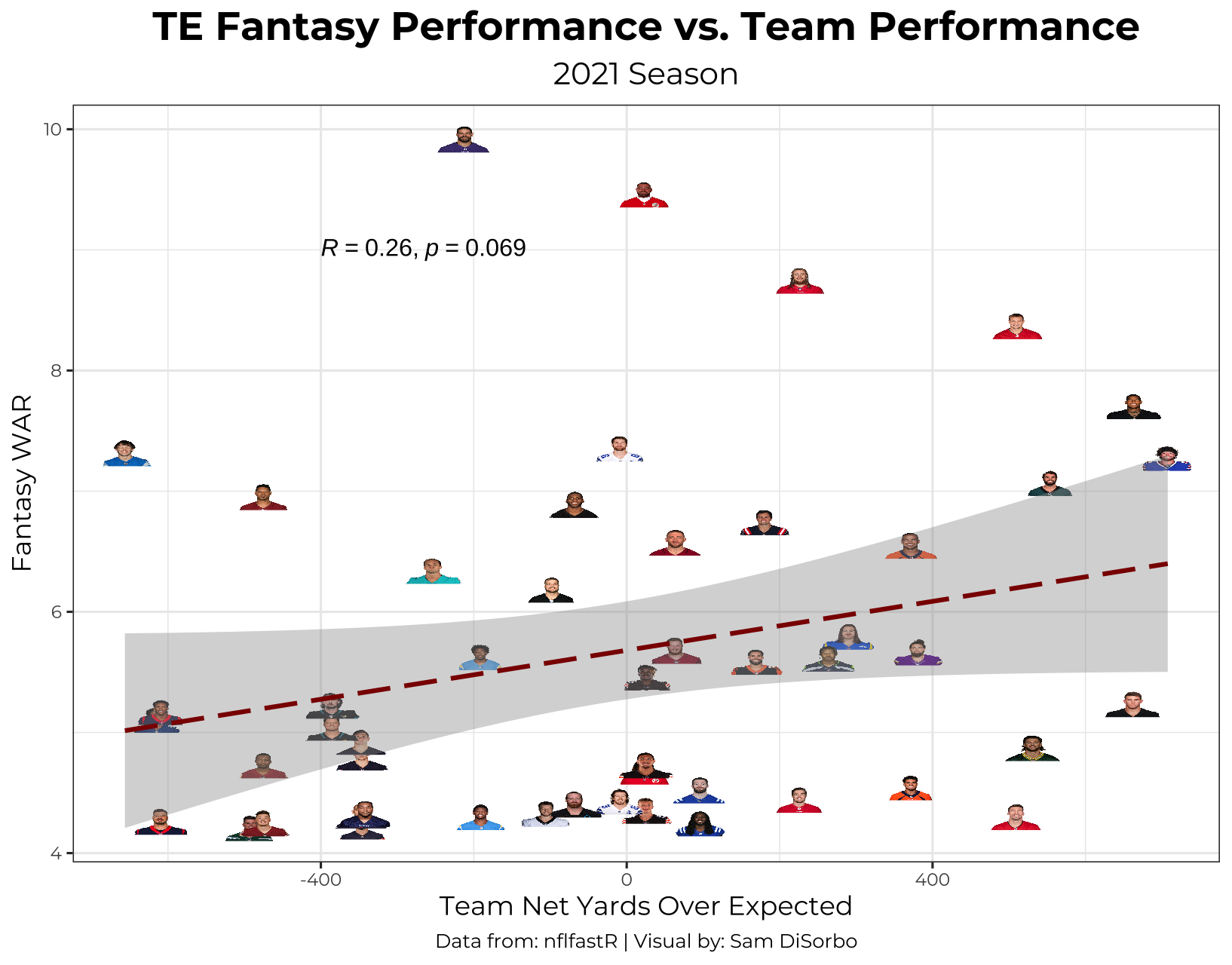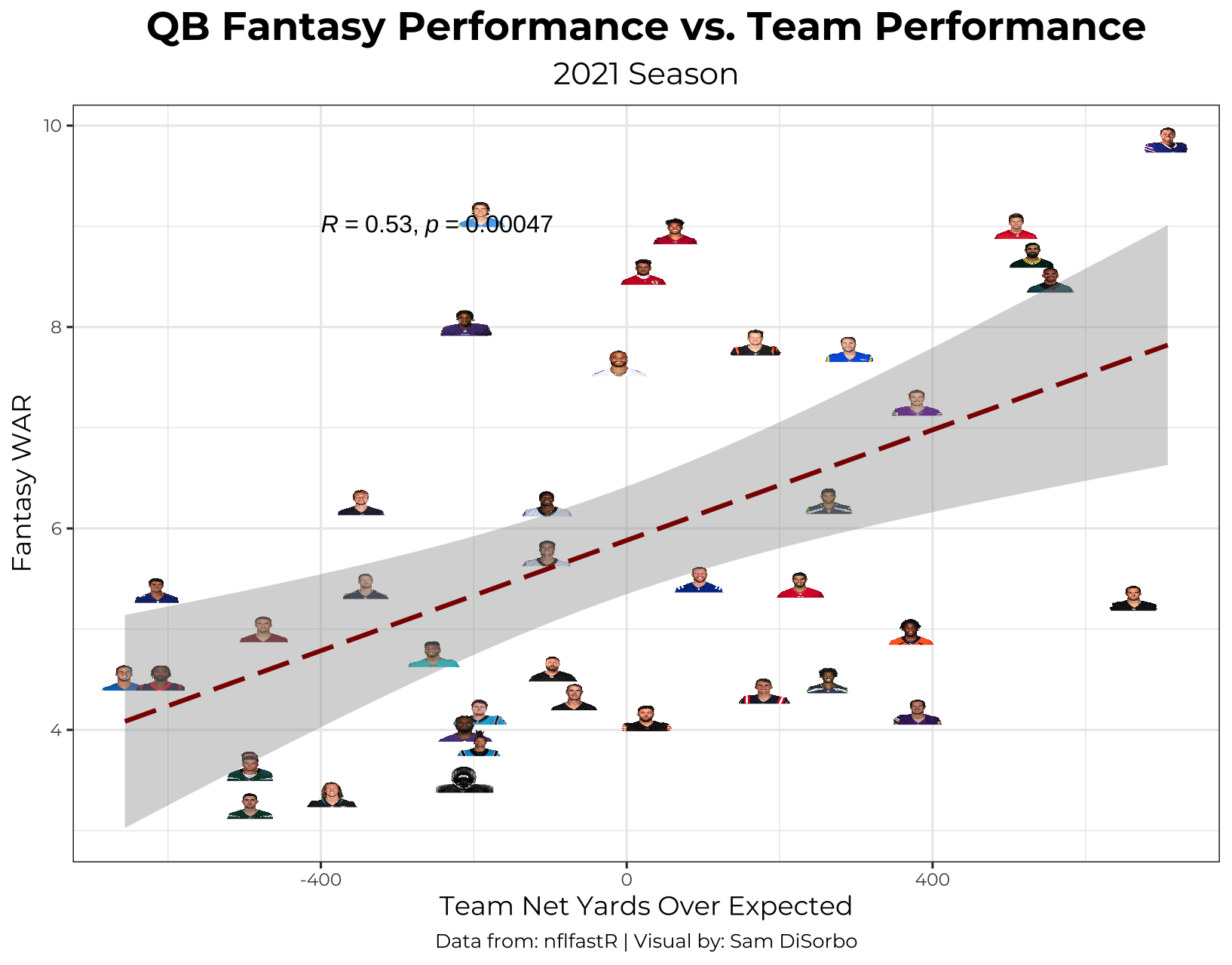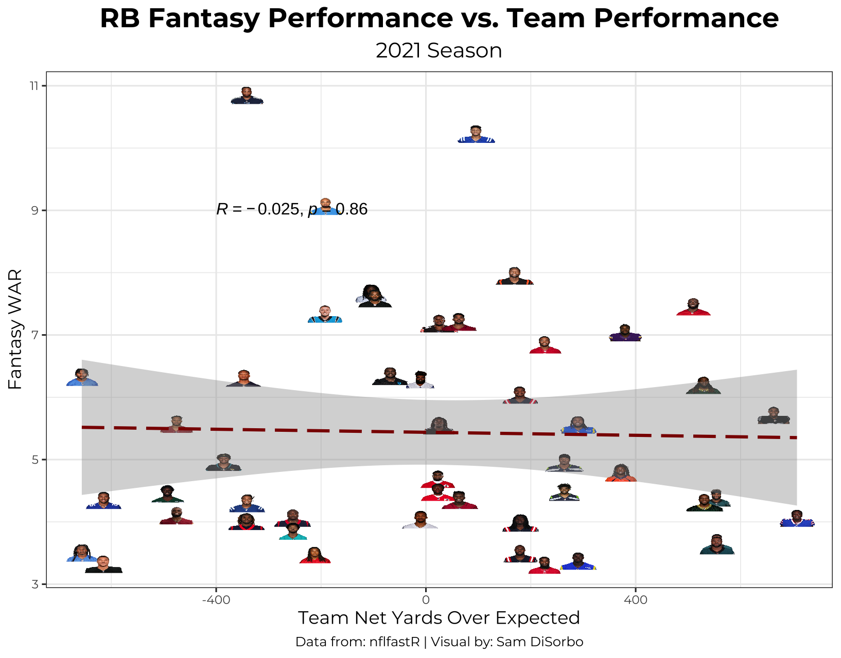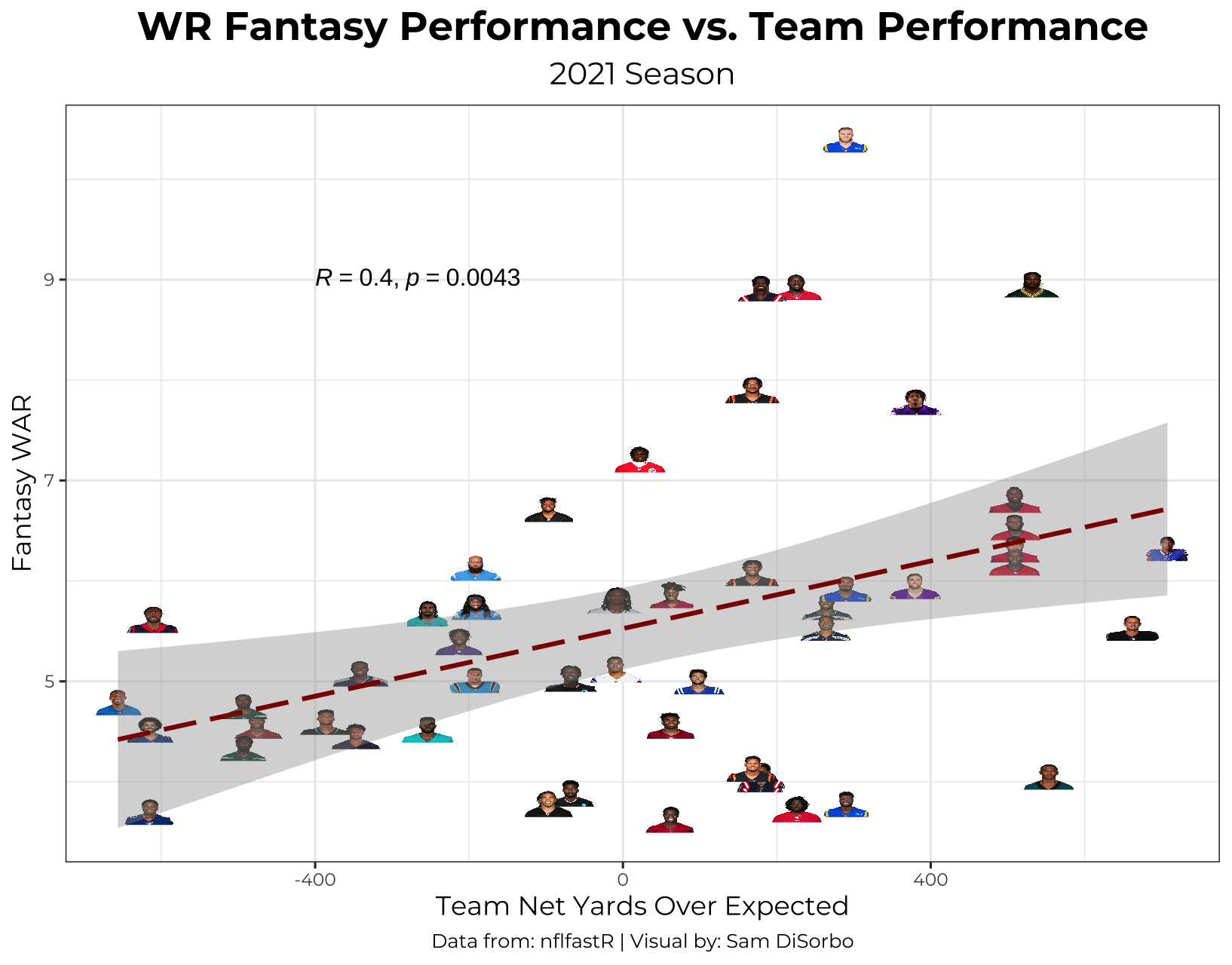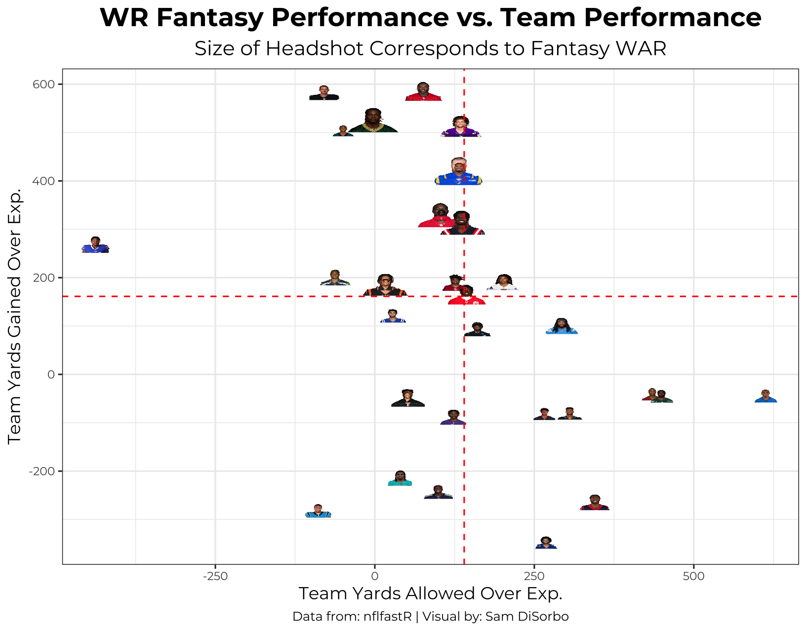 To test this theory, I looked at fantasy performance (based on Fantasy WAR, or wins above replacement) against team performance (yards gained and allowed over expected).