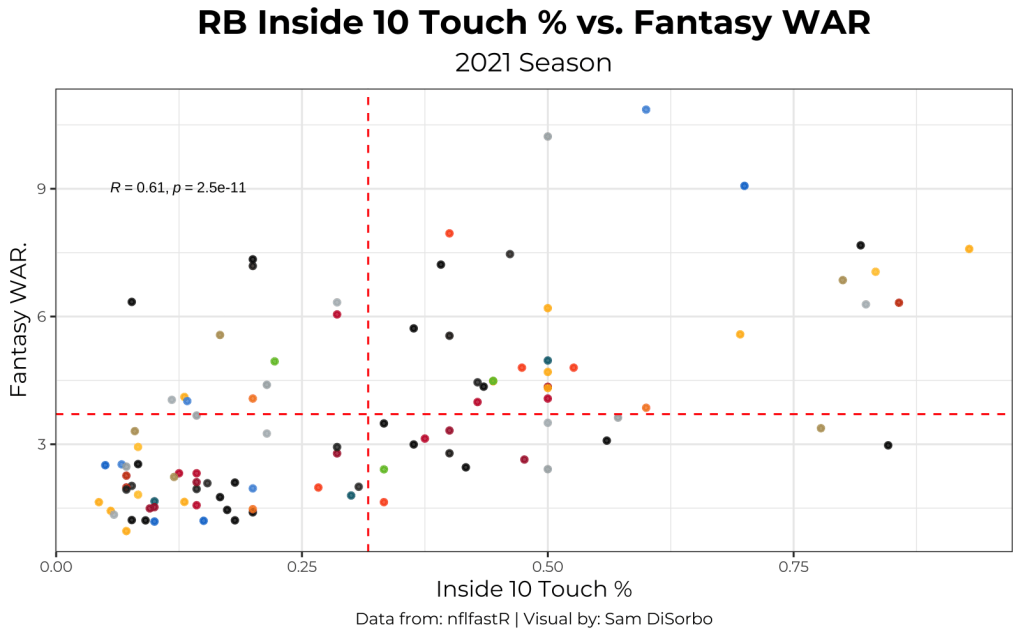 When we shrink this study to touches inside the 10-yard line, the correlation is still high, but not as high as it was previously (R squared-value is 0.37). This is likely due to the fact that there are simply less RBs who got touches inside the 10, hence a smaller sample size to up that correlation.
