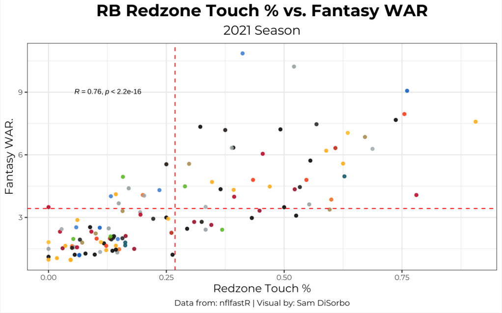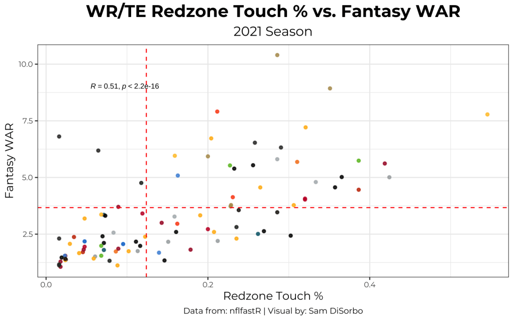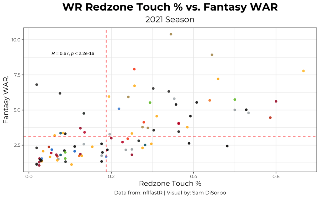 Does this phenomenon apply to WRs as well? Yes! 67% of variation in fantasy WAR can be explained by variation in redzone touch share for receivers.