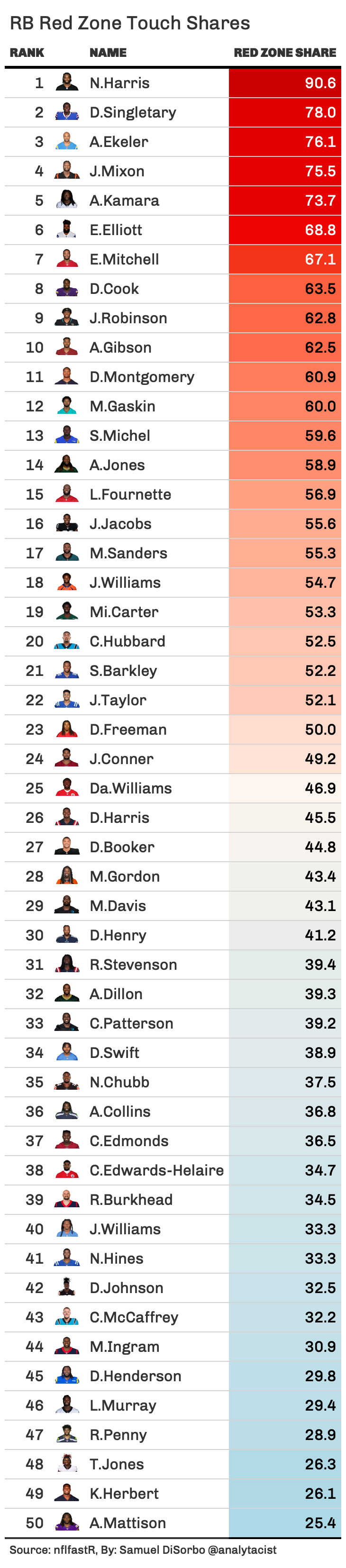 - Leonard Fournette, Aaron Jones, Javonte Williams, and James Conner all struggled getting a dominant role in the redzone last season
