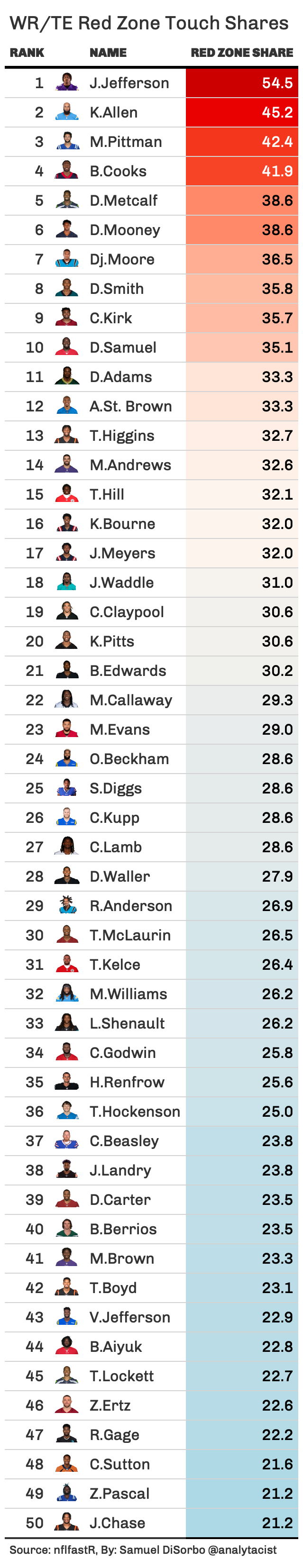 Below are the rankings for WRs and TEs for redzone touch shares. Some things to note: