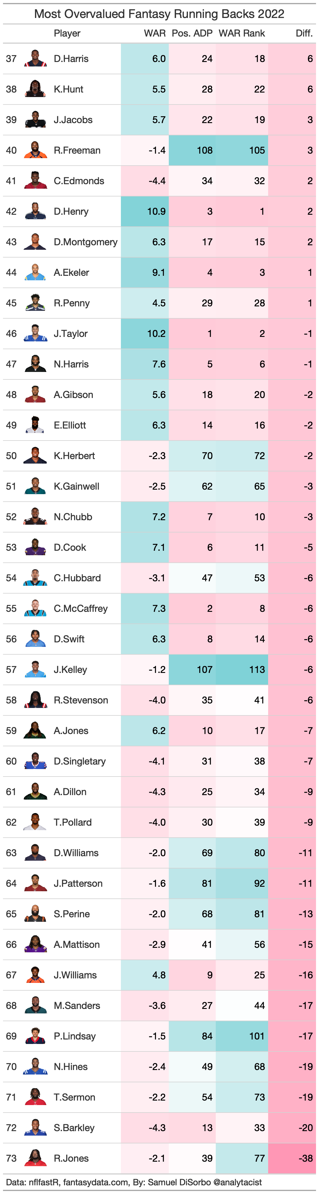 Sanders is being taken 17 positions before his WAR rank, following a season where he posted a -3.6 WAR. He has strong competition for touches in the Eagles backfield, and fantasy owners should be wary of taking him too soon.