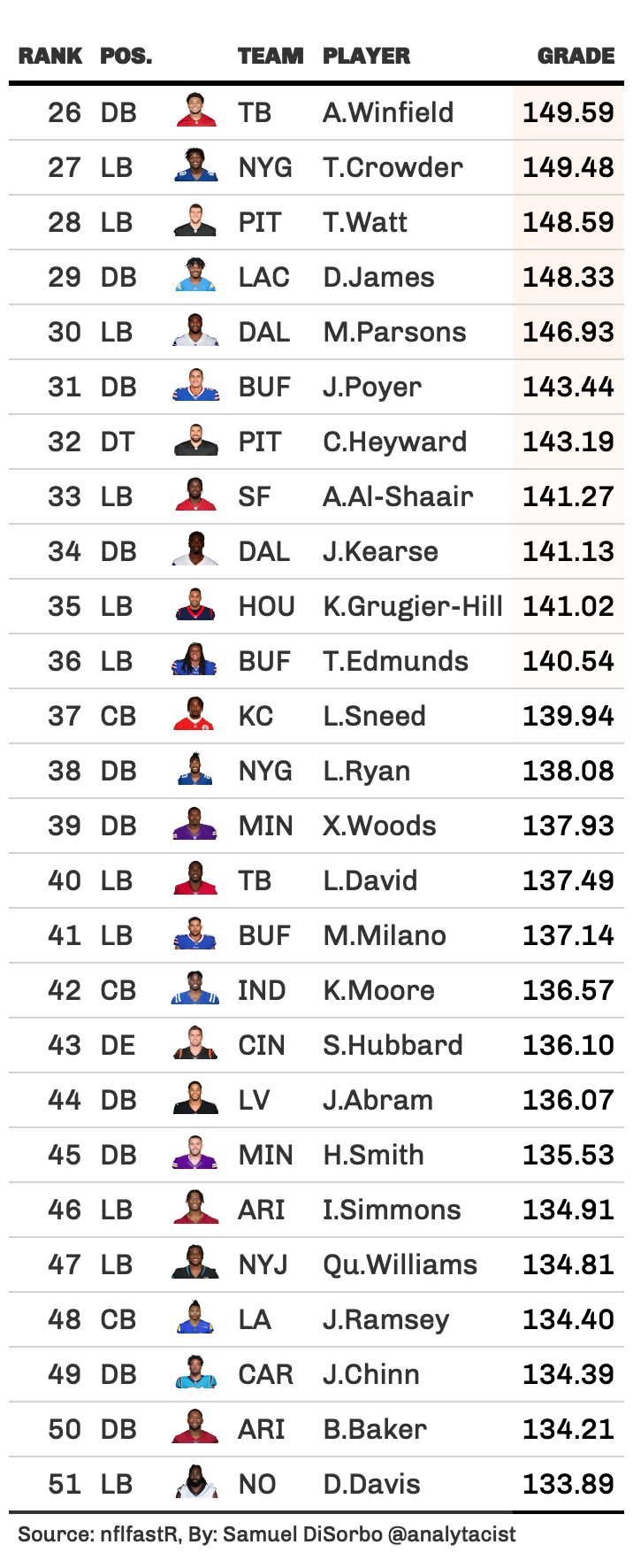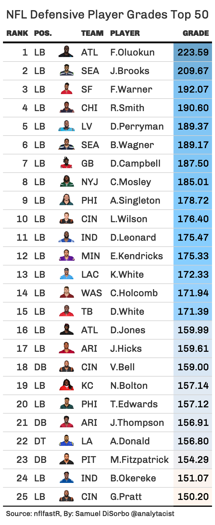 Below you will find the top 50 graded players of 2021. Unsurprisingly, 19 of the top 20 are LBs, as they have the most opportunities to make plays. Note La’Jarius Sneed as the top-rated CB and Vonn Bell as the highest-rated DB. Even more interesting is the appearance of only 2 linemen in the top 50, Aaron Donald and Sam Hubbard.