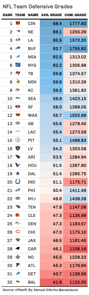 - The Bengals’ defense is stacked. Only one of their players is graded below the division average