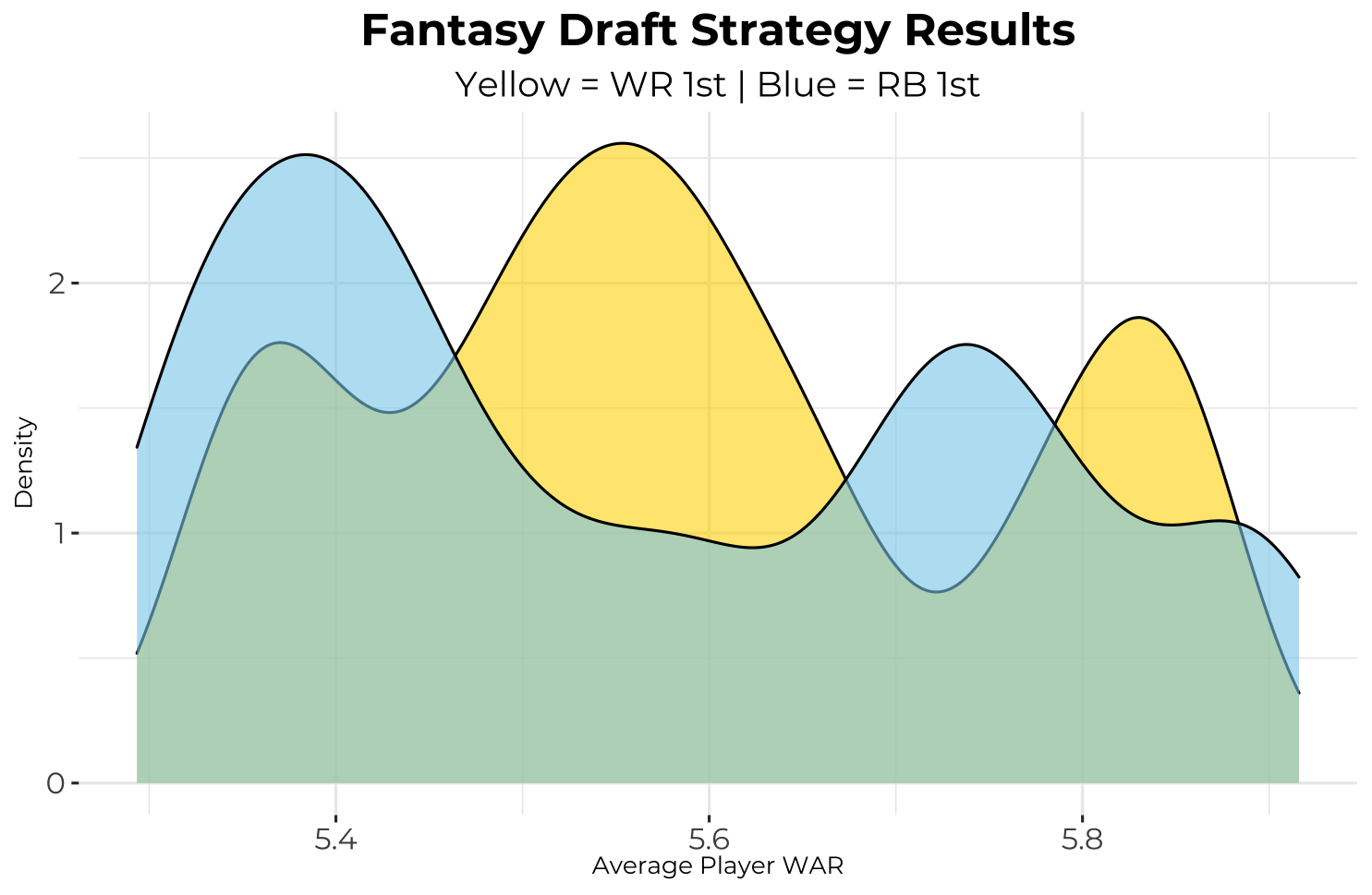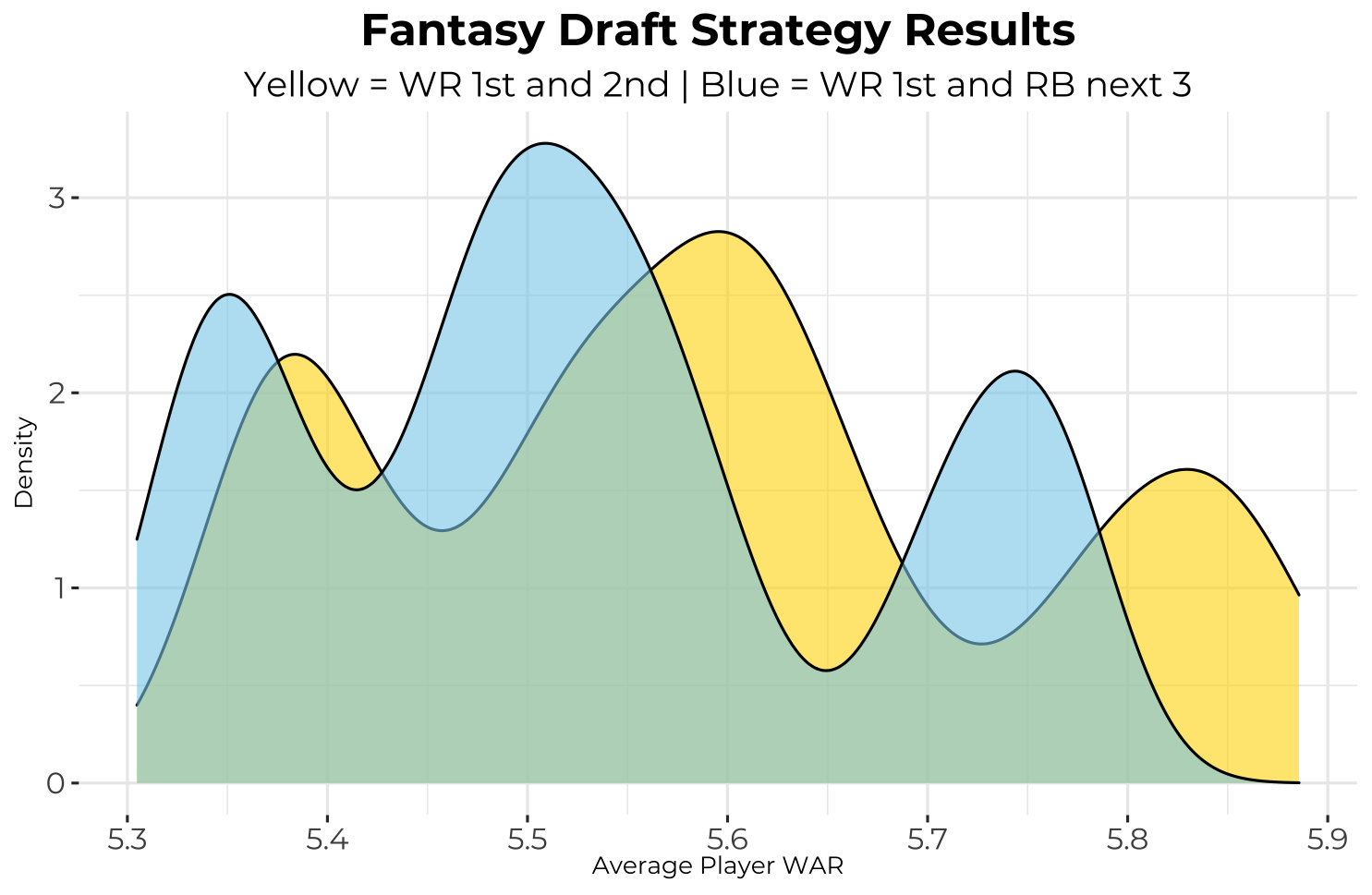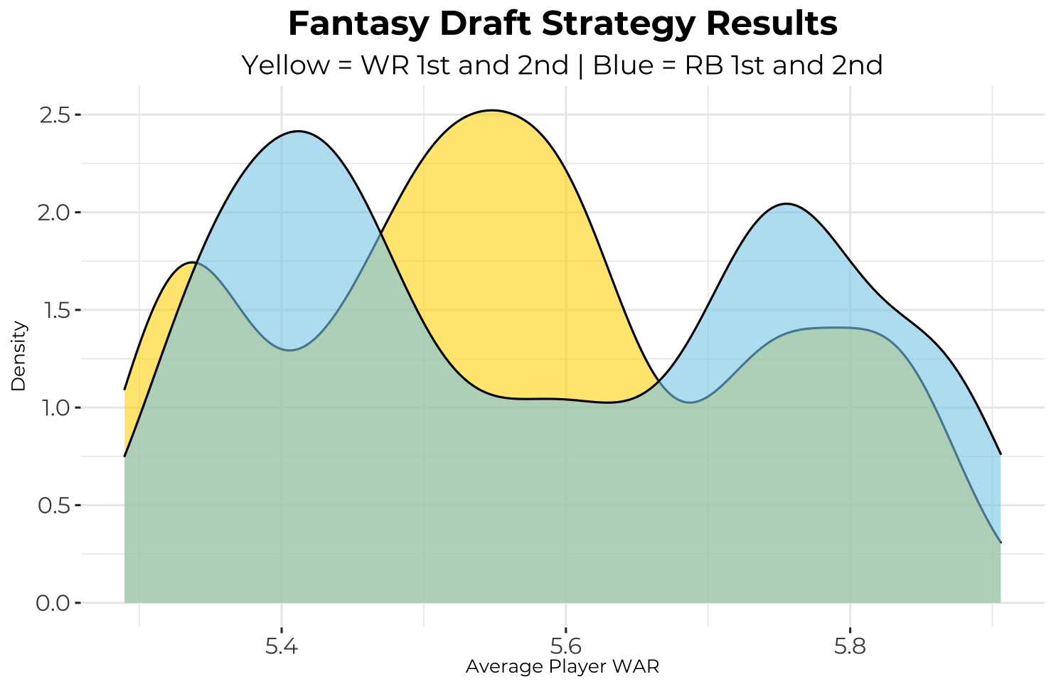 To investigate this, I went back to my draft simulator and designed two strategies that were nearly identical, the difference being their first picks (one took a RB and the other took a WR). I then repeated the process but with one taking a RB 1st and 2nd and the other taking a WR 1st and 2nd. I simulated drafts with these two strategies in a 10-team PPR league (1 QB, 2 RB, 2 WR, 1 TE, 1 FLEX) 1,000 times each and plotted the distributions for each strategy’s average player WAR following each simulation. The results are shown below.