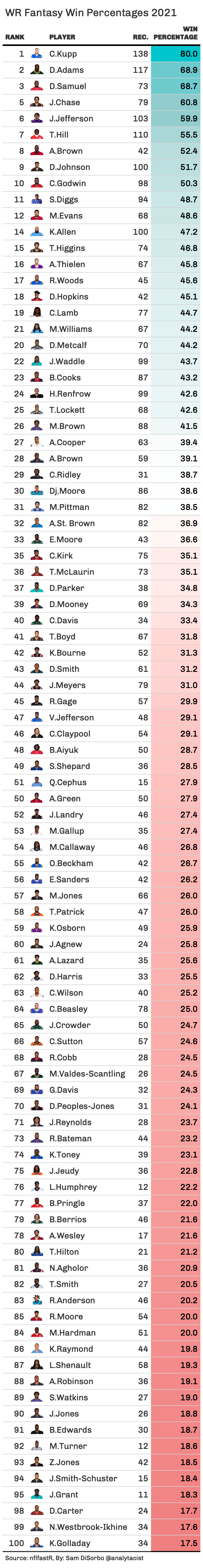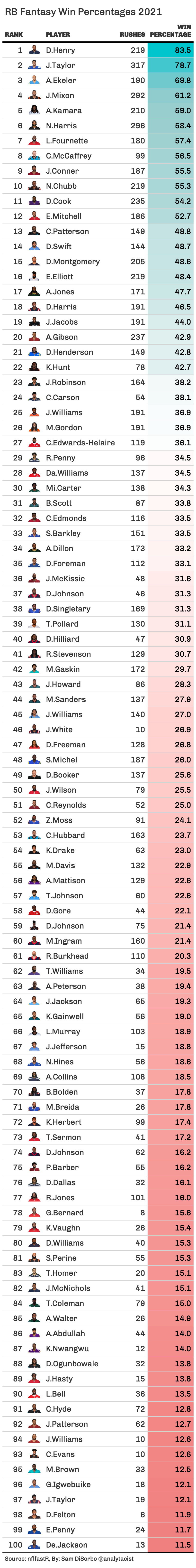 If we take a closer look at the top 50 players in fantasy win percentage (which directly calculates to WAR) for each position, we see that the RB position is a bit more volatile. The variance (sum of how far each number is from the mean) of the top 50 WRs sits at 18.2 WAR (standard deviation of 1.5 WAR), as the variance of the top 50 RBs sits at 25.1 WAR (standard deviation of 1.8 WAR). You’ll also notice that there is a quicker drop-off from the top players in WRs (ranks 5-20), but after the top 20, the RB position drops off much quicker.
