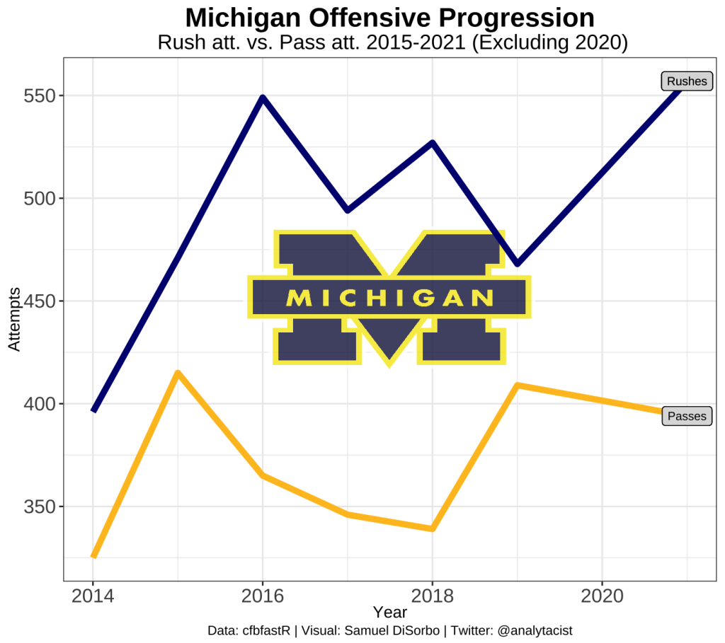 Below we can see Harbaugh’s Wolverine’s trends of rush attempts vs. pass attempts since 2015 (with a lag year to show changes in his first year). What we see isn’t much of a surprise–the Michigan Wolverines LOVE to run the damn ball. Last season alone, Harbaugh’s offense handed the ball off over 550 times, in comparison to their 400 pass attempts. With 57.5% of his plays finding his RB’s gut, there is no questioning how this offense operates. It is especially important to note the uptick in carries following 2019–possibly following a mid-tier Shea Patterson season performance, Harbaugh thought it would be best to fully commit back to his ground and pound style of play if he wanted a chance at beating his rival, OSU (he succeeded in case anyone forgot!).