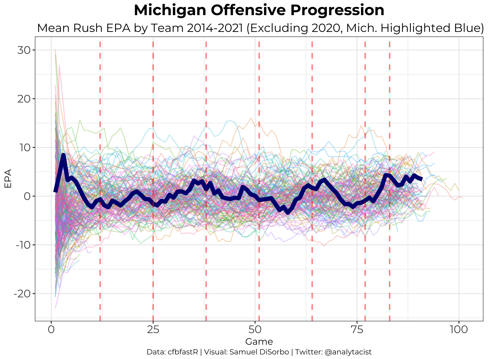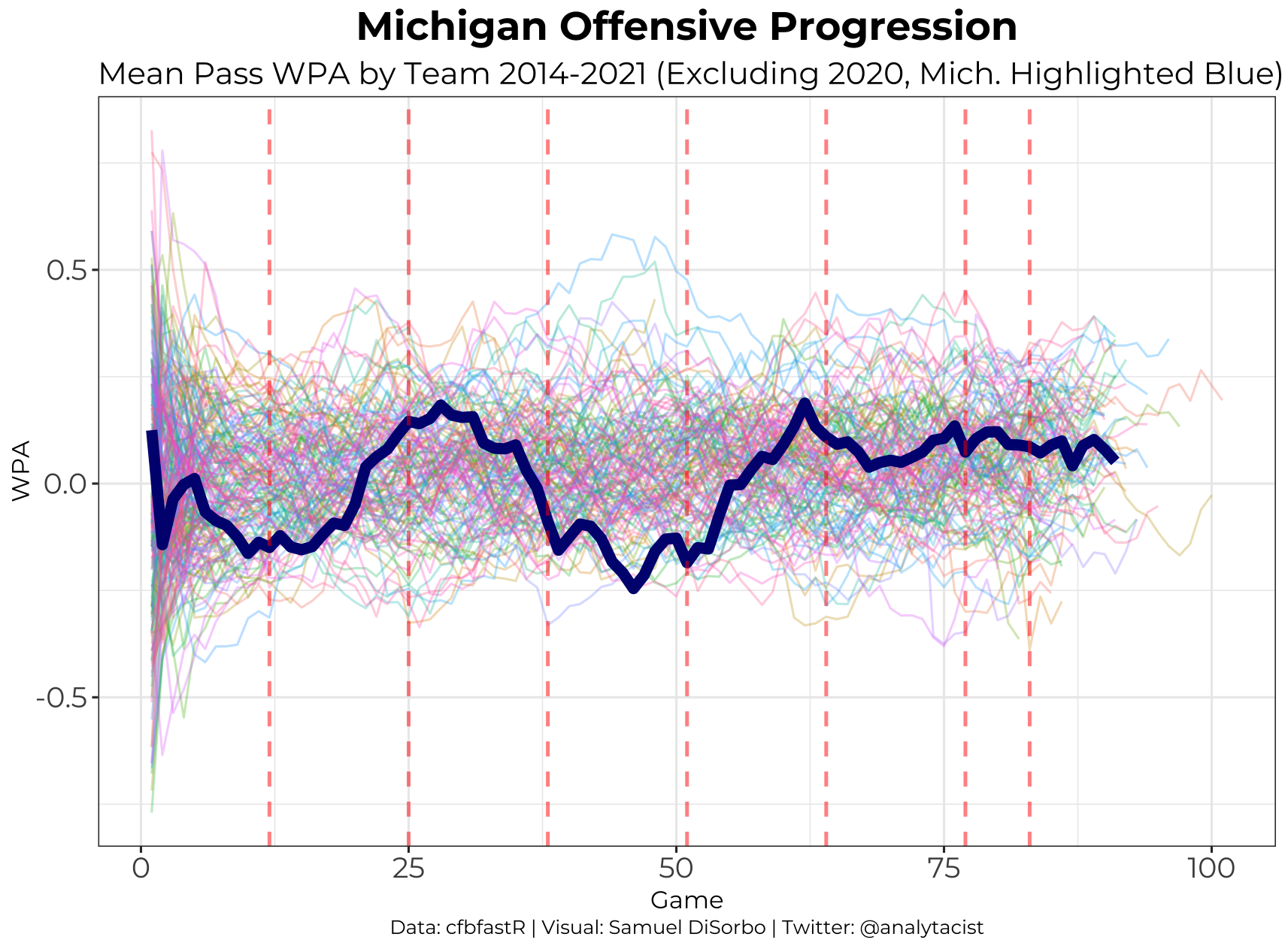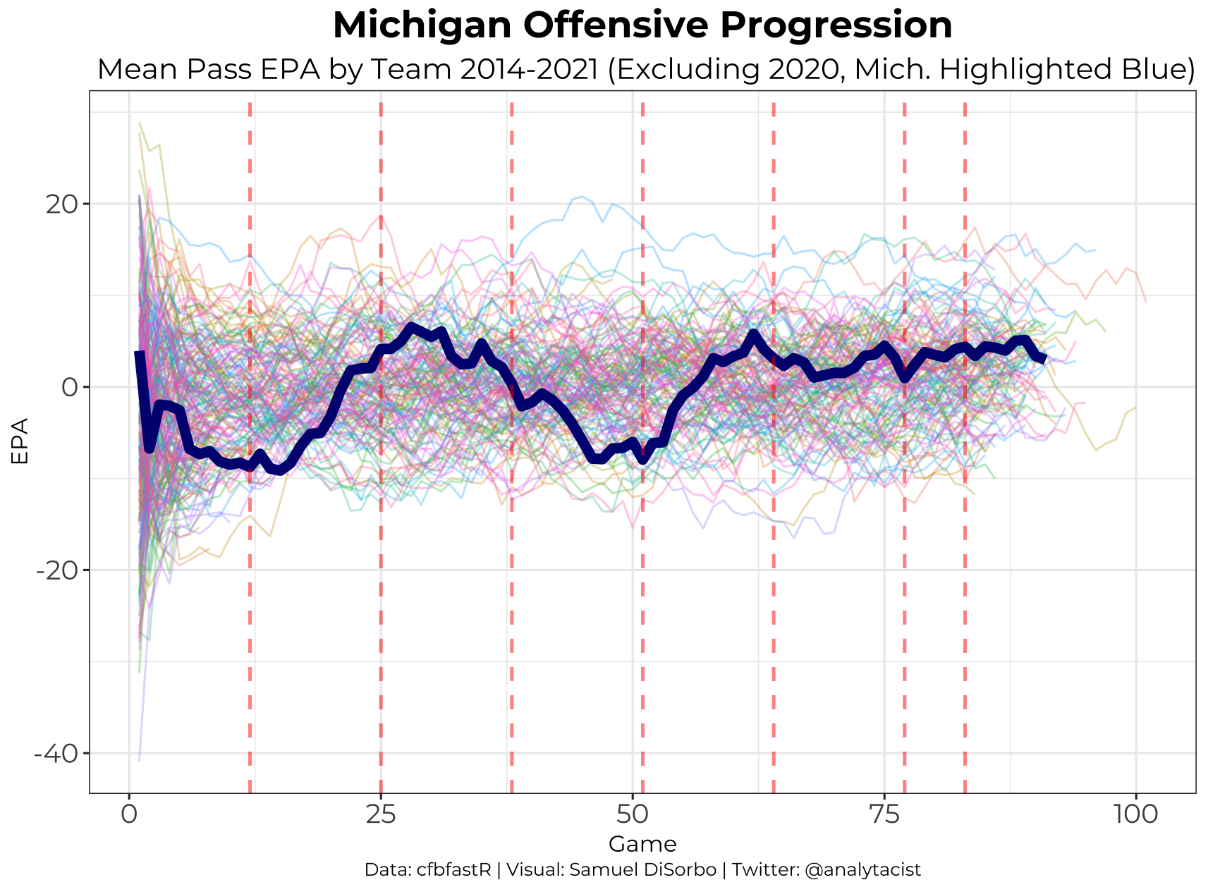 It is also key to look at Michigan’s trends in comparison to the rest of CFB (each start of the season in the graphic is marked by a red dotted line, starting at 2015). When looking at mean EPA (rolling mean calculated on a 10-game basis) for the past 7 years, we see again that Michigan is typically average with their running efficiency–last year’s remarkable season performances from Corum and Haskins however have pushed them near the top going into 2022. We also see Harbaugh’s effectiveness as a QB coach in the second slide. Following his hire in 2015, there was an immediate rise in pass EPA for the team, and despite some struggles by Shea Patterson in 2017, Harbaugh has coached his QB room well, generally keeping them positive for avg. passing EPA.