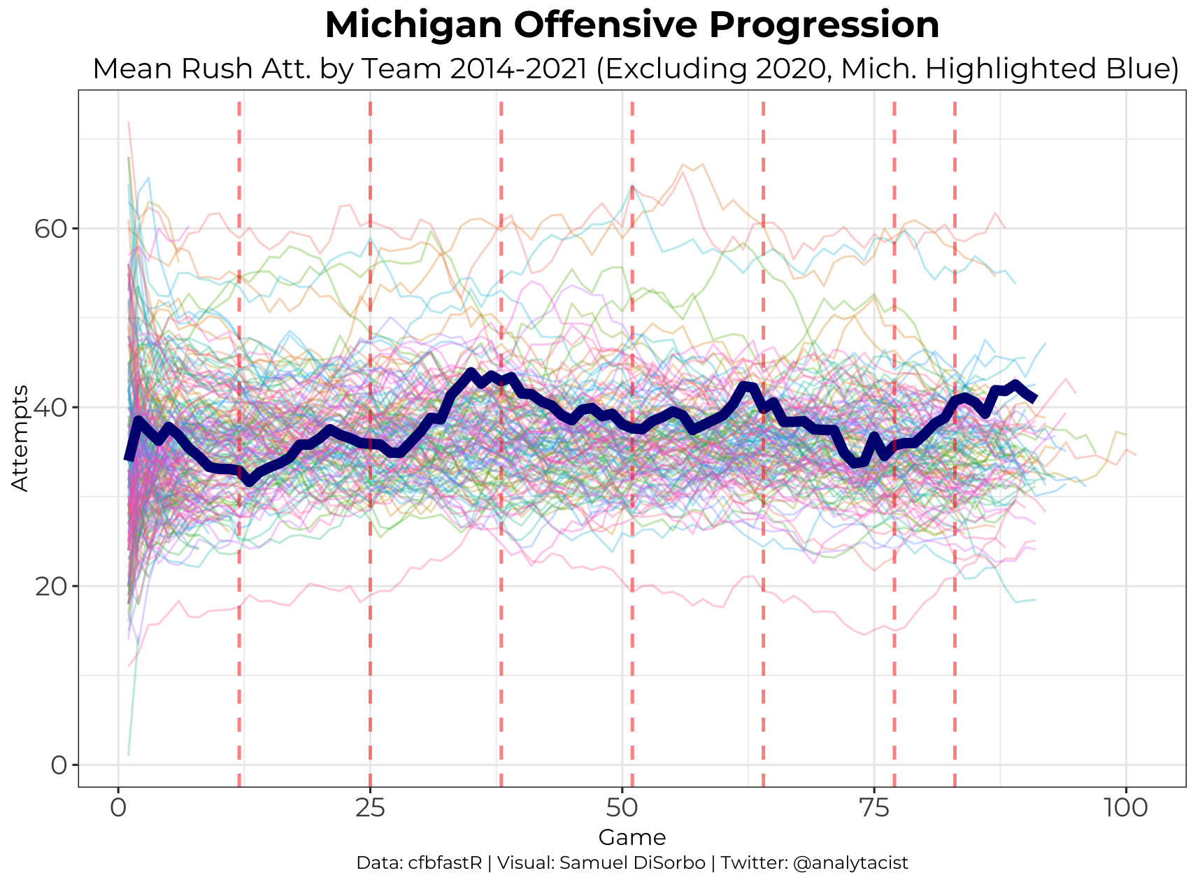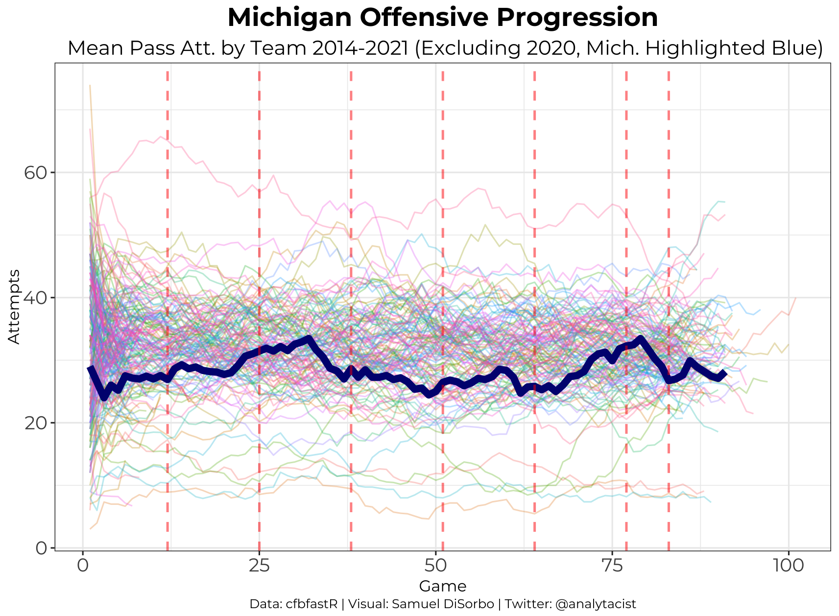 We do see that Michigan lies in the upper tier of CFB offenses in terms of rush attempts, and has been consistent in that manner as well. The direct opposite goes for their passing game.