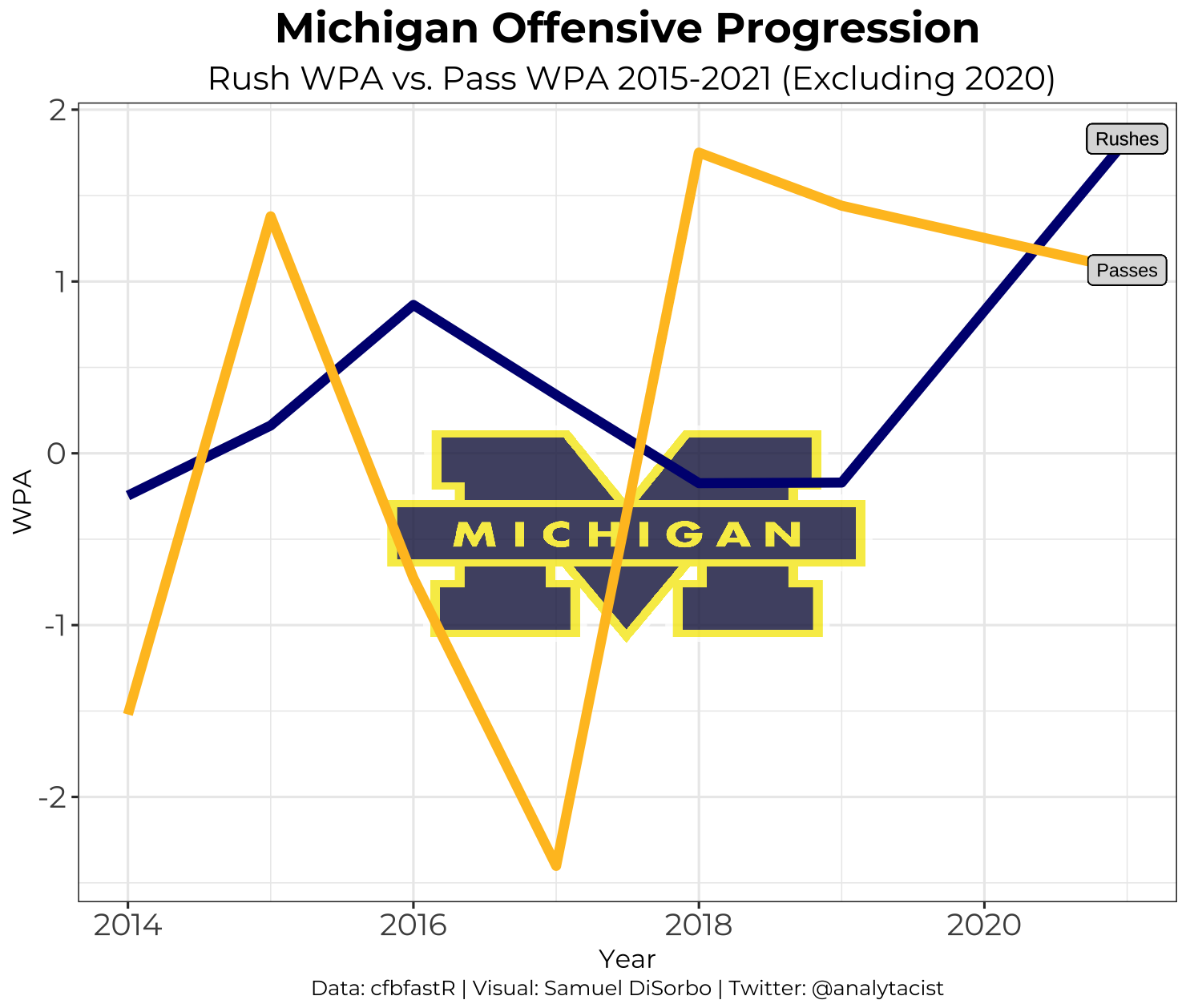 Now looking at Michigan’s EPA (expected points added) and WPA (winning percentage added) progression through Harbaugh’s tenure, the first thing we notice is the net rise in both stats over the past 5 seasons. Michigan is getting better. Even more noticeable is the volatility of Harbaugh’s pass offenses vs. his run offenses. While his running game EPA totals have typically fluttered at a net of 0, the Wolverine passing game fluctuates each year. Hopefully, they will be settled in from this point out with McNamara coming off a stellar season and J.J. McCarthy ready to prove himself.