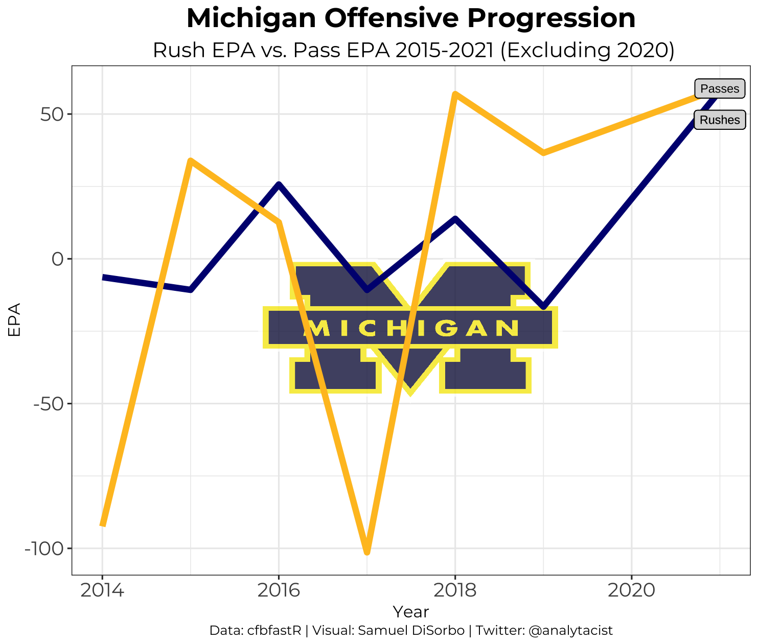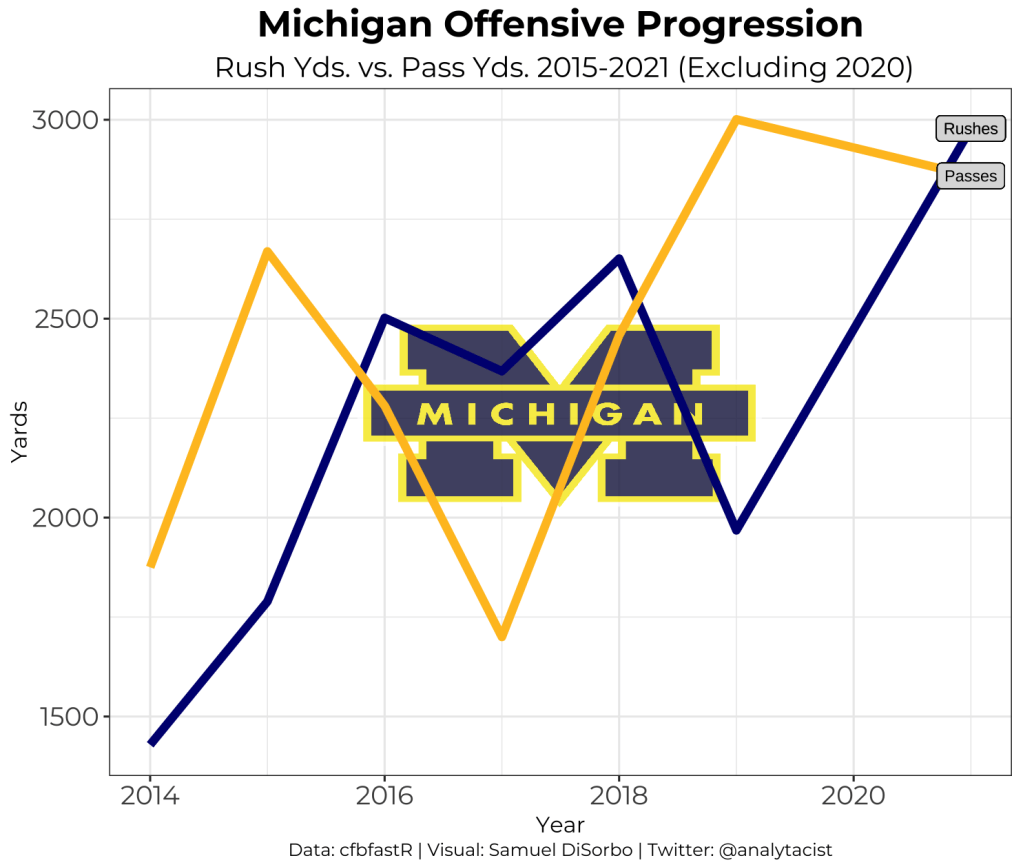 Now let’s take a look at how effective this run-heavy offense has been. Michigan has not only been incredibly efficient with their run game, racking up over 2000 rush yards in every season other than 2015 which Harbaugh has been at the helm, but has also done a fairly decent job keeping their production balanced. In each of the 3 seasons Harbaugh has been coach and the Wolverine’s pass/rush yard totals were well balanced (2016, 2018, and 2021), they have made a New Year’s Six Bowl (Orange, Peach, and Orange). It can’t go unsaid that the Wolverines played in the Outback bowl in 2017 without a strongly balanced offense, but it is without a doubt that offensive harmony will help push a team to its full potential.