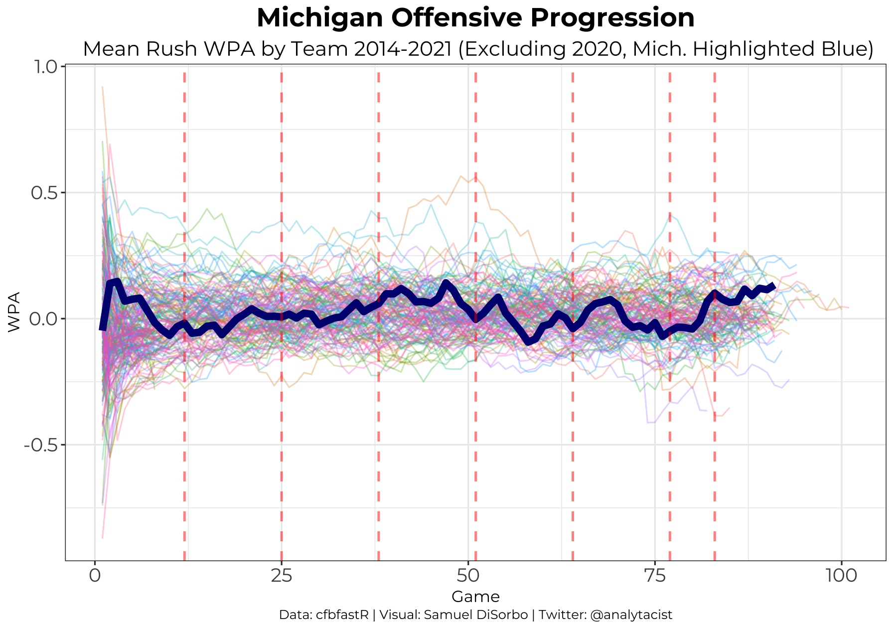 We see similar trends with rolling average WPA for the Wolverines as well.
