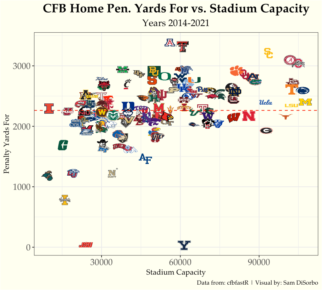 My next task was to plot the total penalty yards for (not accounting for penalty yards against) earned at home for each team. The results were stunning. There is a strong correlation here between penalty yards for and stadium capacity, hinting towards something none of us should be surprised about–the larger the stadium, the greater the home-field advantage.
