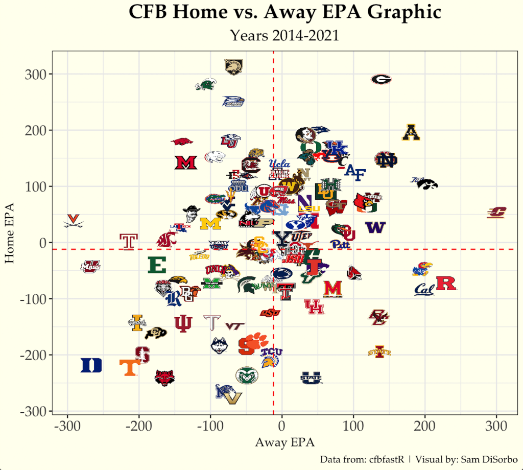 My approach was simple: see which teams had the highest cumulative EPA at home in the past 7 years. It was also interesting to compare each team’s home and away EPA–the larger the gap, the more reliant the team is on home-field advantage. Below are the top 100 in home EPA from 2014-2021.
