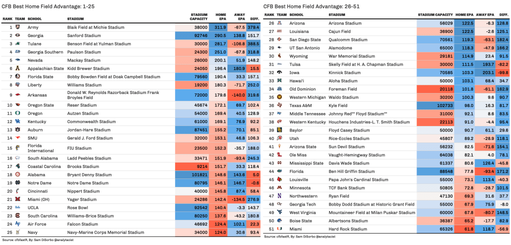 -Army at #1 overall. This team has been very reliant on home-field advantage in recent years. With a near 380 point difference in home vs. away EPA, there is no doubt that Army is a different team at Michie Stadium.