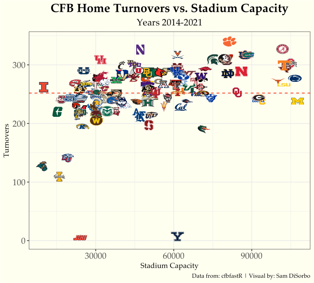Looking at the number of turnovers created vs. stadium capacity also yields some favorable results. Nearly identical to the penalty yards chart, I had to do a double-take when I first made it. One thing remains certain: larger stadiums offer huge advantages to the home team, especially on the defensive side of the football.