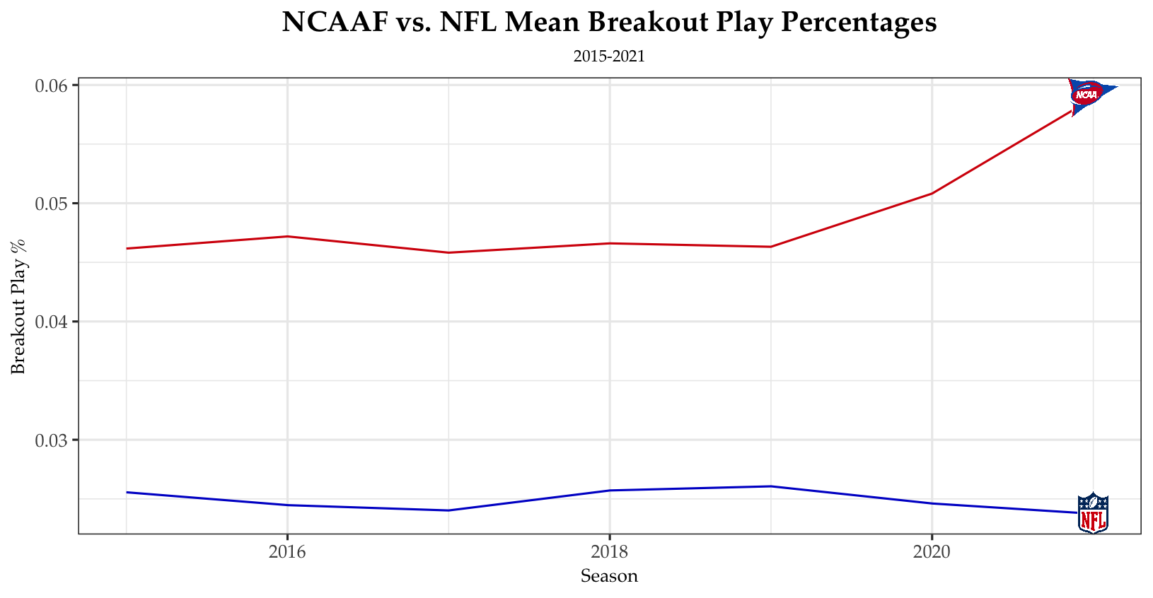 Next, let’s take a look at breakout plays–I am defining these as plays where more than 25 yards were gained. When we look at the percentage of breakout plays since 2015 for each league, the NCAAF trounces the NFL. Near double the percent of the NFL each season, there is no questioning that college football is a more explosive game–whether this is due (which is likely) to the lower skill levels of college defenses or not, there is a clear dichotomy between the two here.