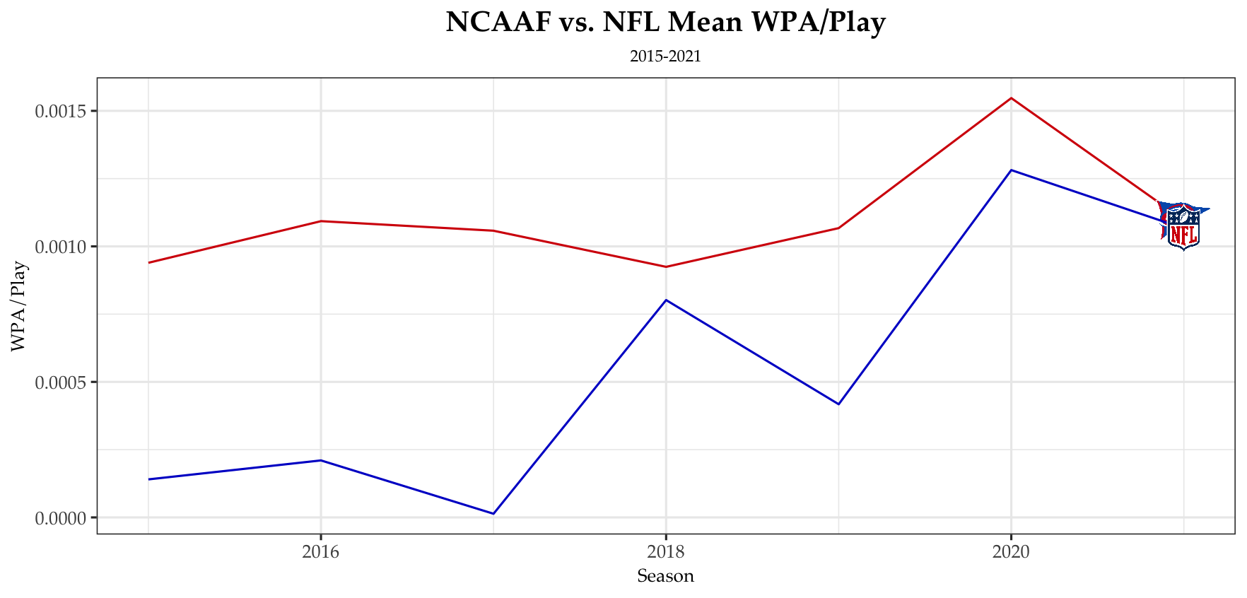 First and foremost, we can check out the average WPA/play for each league–this will give us an idea of average ‘excitement’ as plays with higher WPAs implies greater game implications, hence making more thrilling plays. The results are quite telling; the WPA/play for the NCAAF is more than double the NFL at 13%.