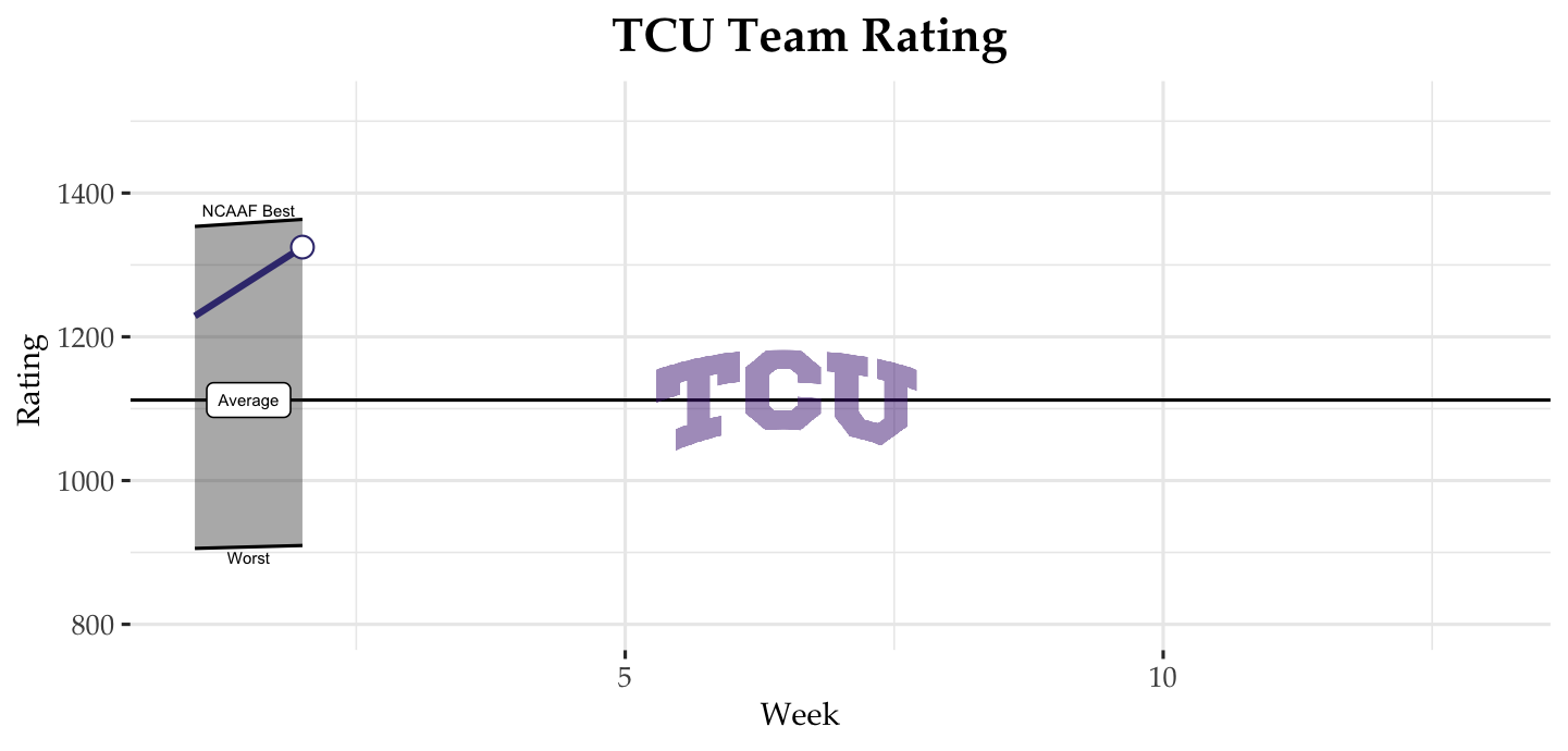 - TCU’s dive into the top 10. The Horned Frogs annihilated their first two opponents, giving them a boost into week 3 (see the 96-point change in their SAM rating). Their next 4 games will be a true test of their skill as they face SMU, Oklahoma, Kansas, and Oklahoma St.