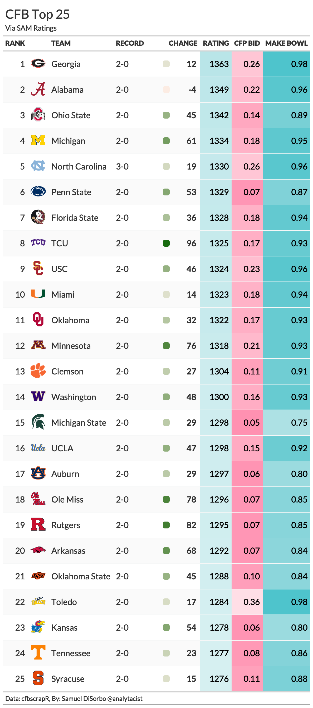 The SAM model gives us the same top 4 teams as the AP poll, which is a great sign! To any CFB watcher, these teams are clearly the best of the best–how could we trust this model if it couldn’t identify those 4 as the leaders? Some other big takeaways from week 2: