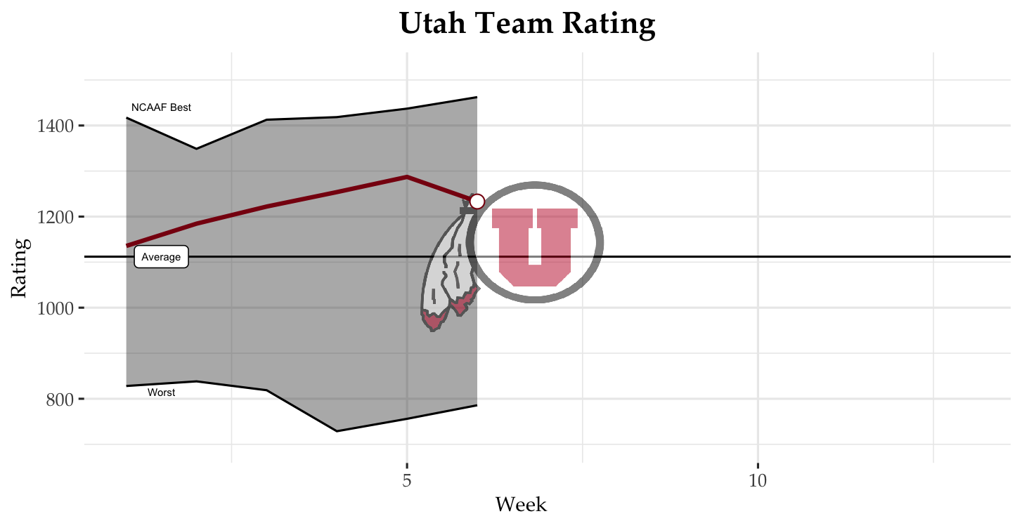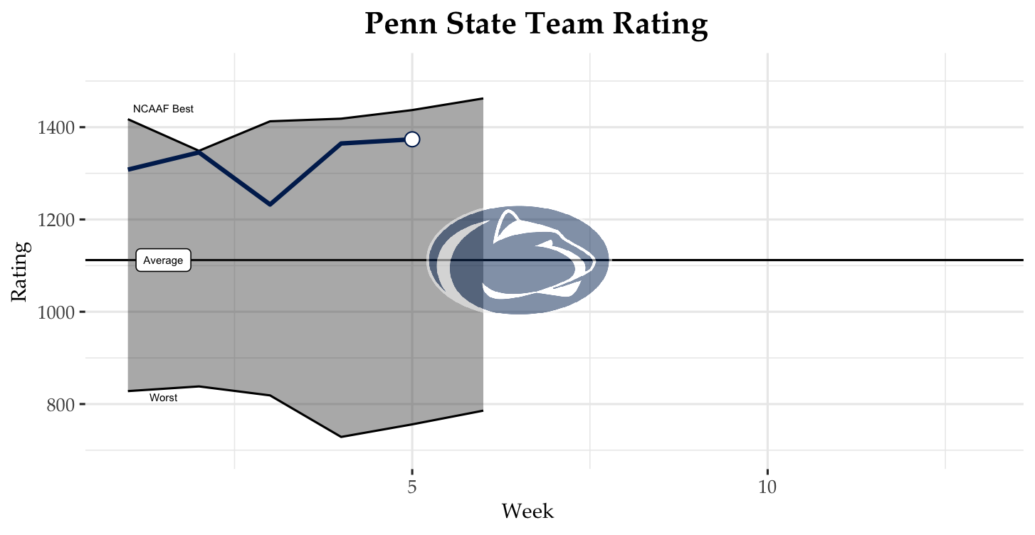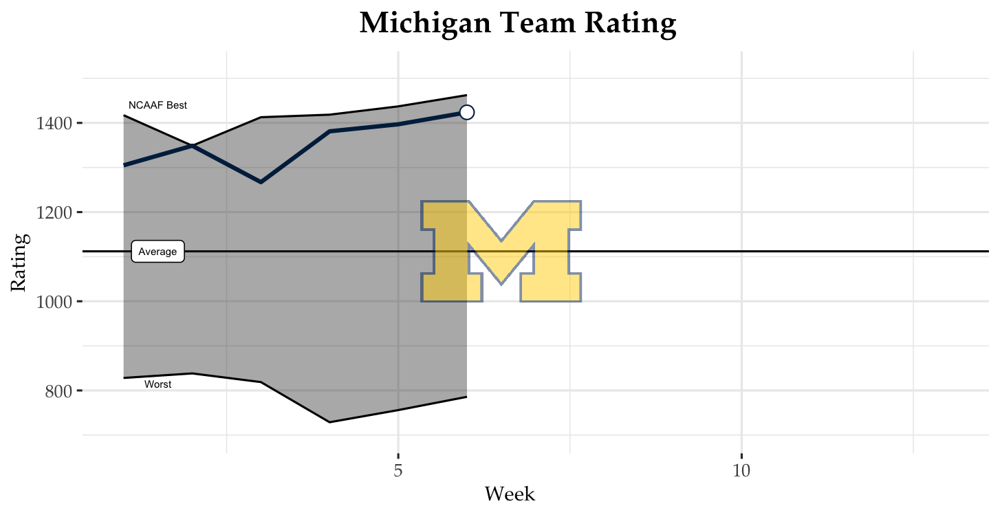 This BIG 10 showdown has it all. Maize out, Big Noon Kickoff, fierce rivals both coming in undefeated. Our model has Michigan at a 57.2% chance to win Saturday. Check out their (very similar) ratings arcs below.