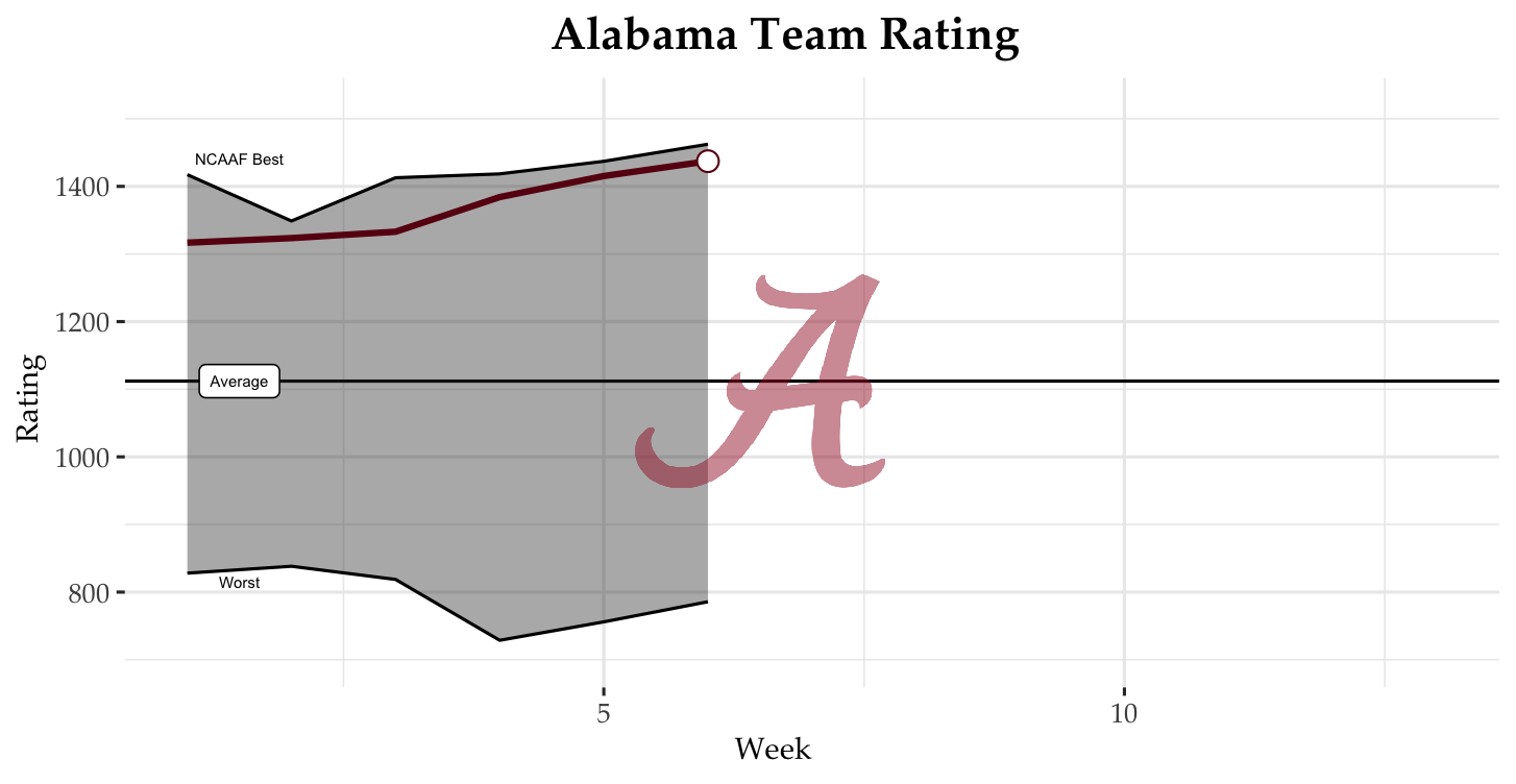 This SEC showdown is sure to excite. If Bryce Young is inactive, the Crimson Tide are going to have to dig deep to stop the red-hot Volunteers. Our SAM model has Alabama at a 55.2% chance to win on gameday. Check our their rating arc comparison below.