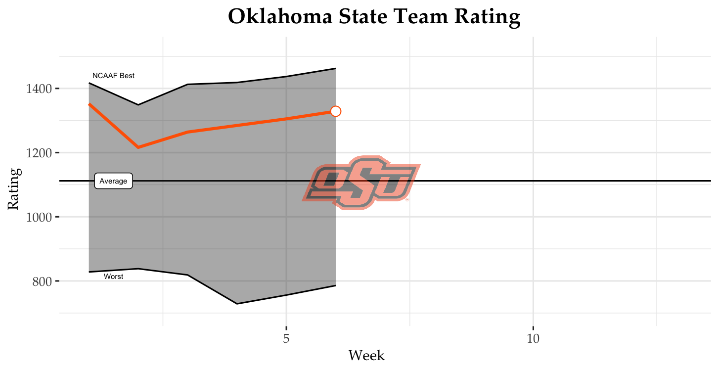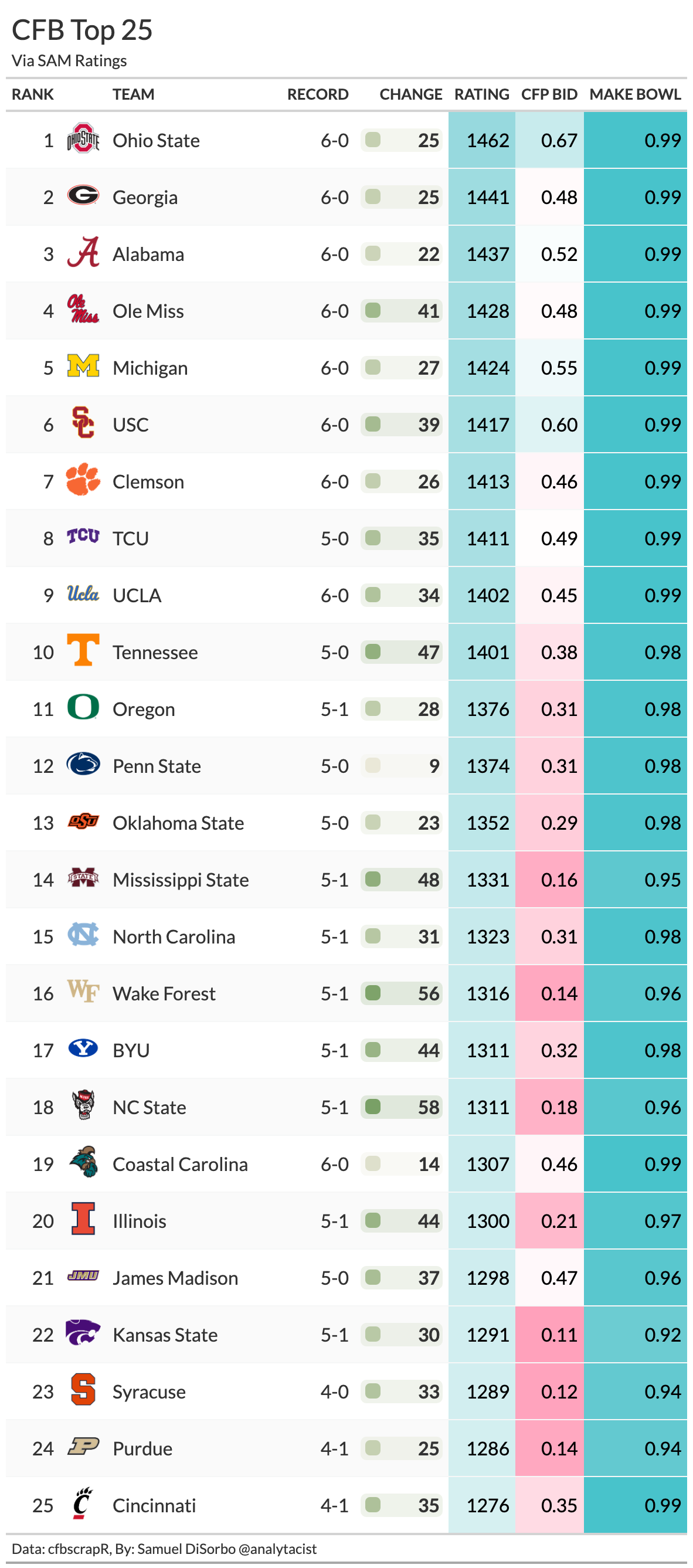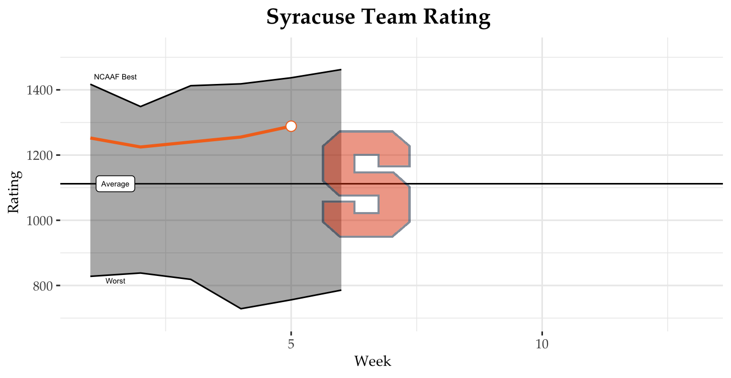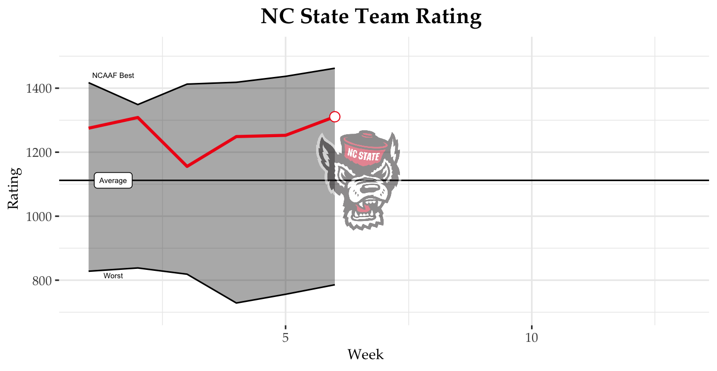 This is a must-win for Syracuse, to show they belong in the top 25. As for NC State, they are looking to fight off a second loss, which would completely ruin their already tarnished CFP hopes. The SAM model gives NC State a 53.2% chance to win this game. See their rating progressions below.