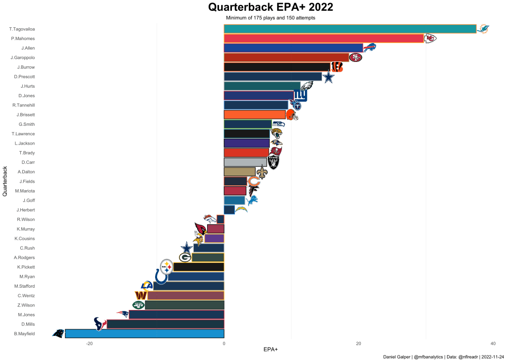 Quarterback EPA+ = (EPA/Dropback – League Average EPA/Dropback) * 100