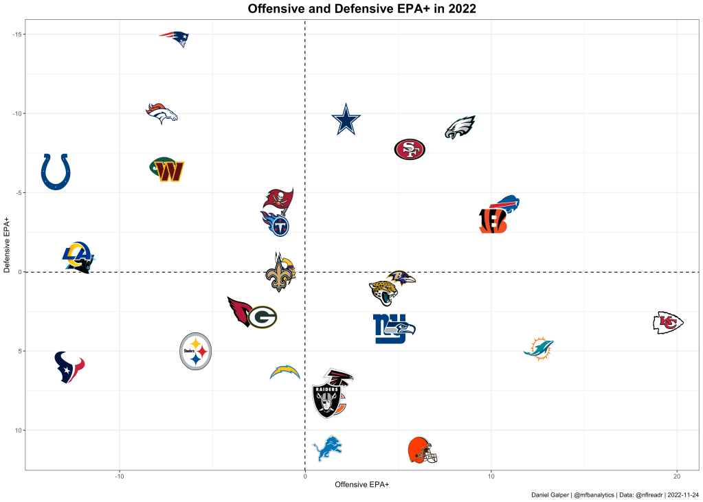 With our EPA+ formula, we can look at each teams offensive and defensive EPA+ and use 0 as the integer that represents league-average.