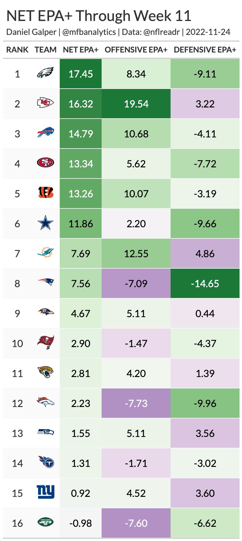 The NET rating has become wildly popular in the NBA as a way to combine offensive and defensive efficiency ratings. We can do the same thing in the NFL using team EPA+ data.
