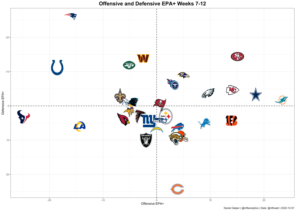 Since Week 7, Buffalo found themselves around at 15th in NET EPA+. Because of their unbelievable defense, the Patriots sit at 8th. New England has a unique path to offensive success tonight in addition to the the elite defensive performance we should expect from them. If the Patriots can become even an average offensive team, they will be scary down the stretch.