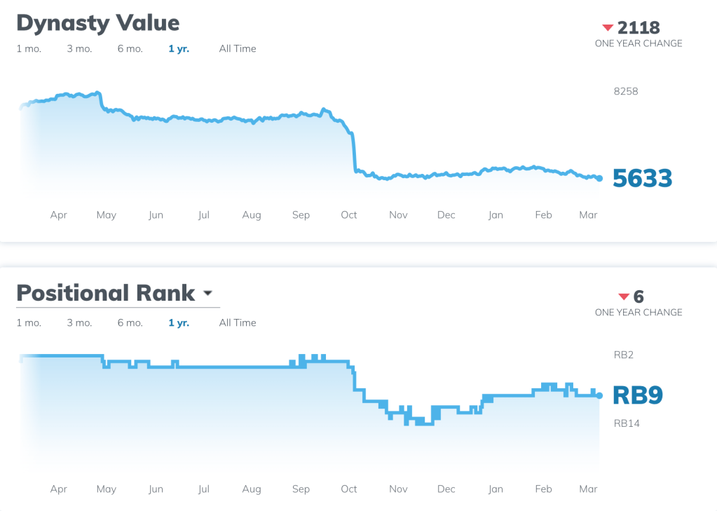 The image above demonstrates this massive drop-off in value. His value has since evened out, returning to RB7 at the time of this article’s publishing. The injury left many dynasty players, including myself, in a very tough position. This article will aim to find the best course of action for Javonte’s shareholders.