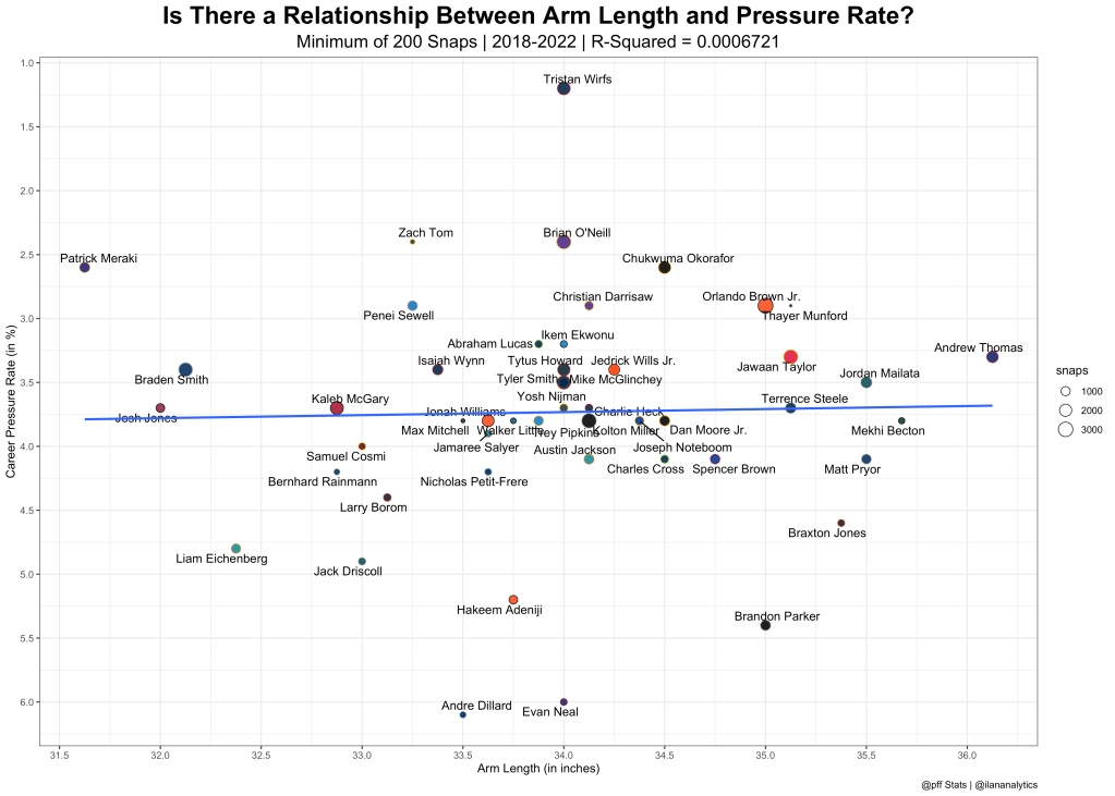 Something I wanted to touch on was arm length and with Wright’s arm length being 33.75 inches they are on the shorter side. I did a little research into a tackle’s arm length and its correlation or relationship with career pressure rate. In this I found there to be absolutely no correlation between arm length of a tackle and their pressure rate. While selection bias does exist in tackles with arm lengths 33 inches or lower because many become guards, that does not hold relevant to Wright who is part of a very large sample. So his 33.75 inch arms are of absolutely no concern because as you will see later in the film section, he is very strong in both his anchor as well as his arms and hands.