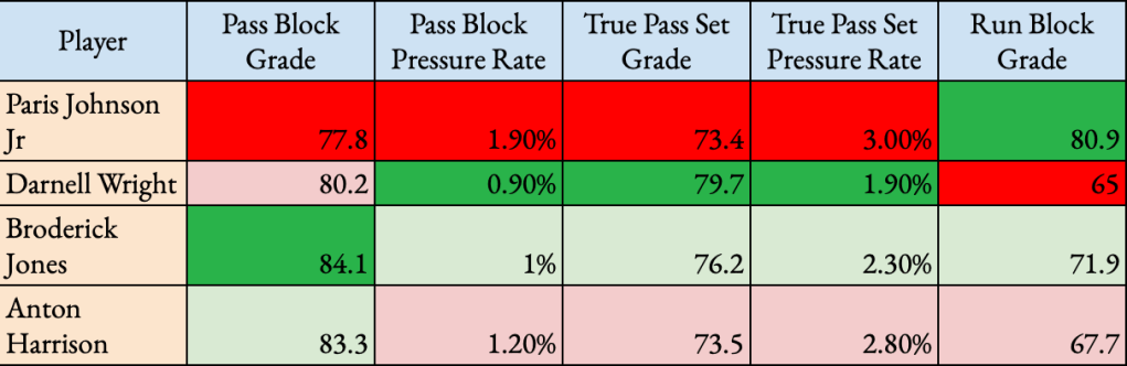 In 2022, according to PFF, Darnell Wright allowed 0(!) sacks and that was with Hendon Hooker having a 29% pressure to sack rate. On all pass sets, Wright allowed an absurd 0.9% pressure rate and ended the season with an 80.2 pass block grade per PFF. In true pass sets, which is described as “excludes plays with less than 4 rushers, play action, screens, short dropbacks and time-to-throws under 2 seconds” by PFF, Wright surrendered once again 0 sacks and a pressure rate of 1.9%. His PFF grade on true pass sets was 79.7.