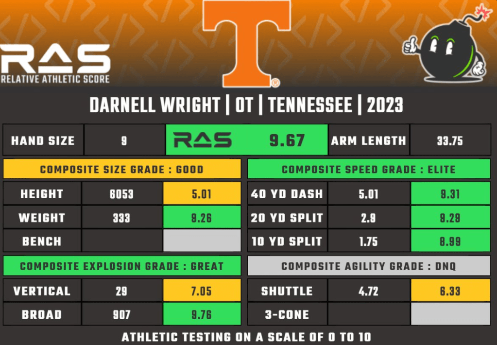 Darnell Wright did every test at the combine outside of the bench press and 3-cone. In the drills he completed he scored a 9.67 Relative Athletic Score (RAS) out of 10. RAS is a metric created by Kent Lee Platte (@MathBomb) to try and put an overall athletic score to a prospect’s testing relative to other players in their position. Wright’s 9.67 RAS was the 43rd BEST out of 1293 tackles to have entered the league and taken part in the combine since 1987.