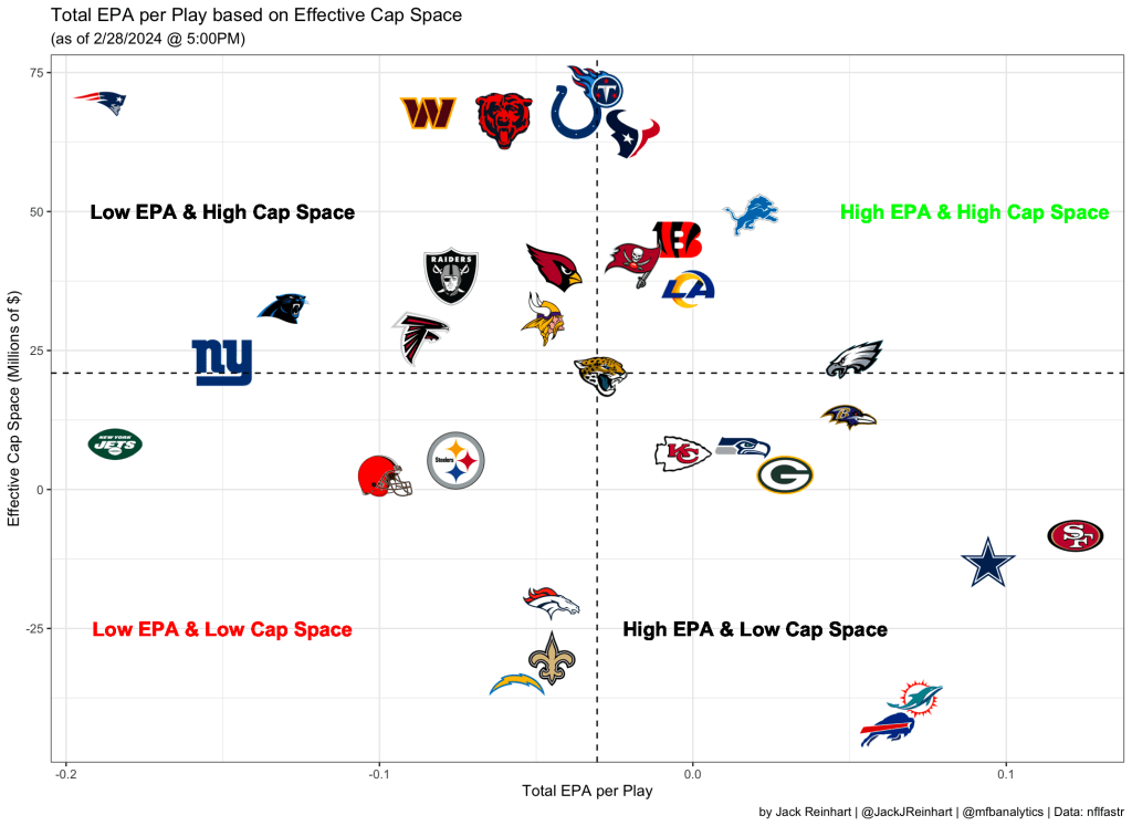 The graph below demonstrates Detroit’s unique position of both being among the league’s best in total EPA while also having incredible salary cap flexibility.