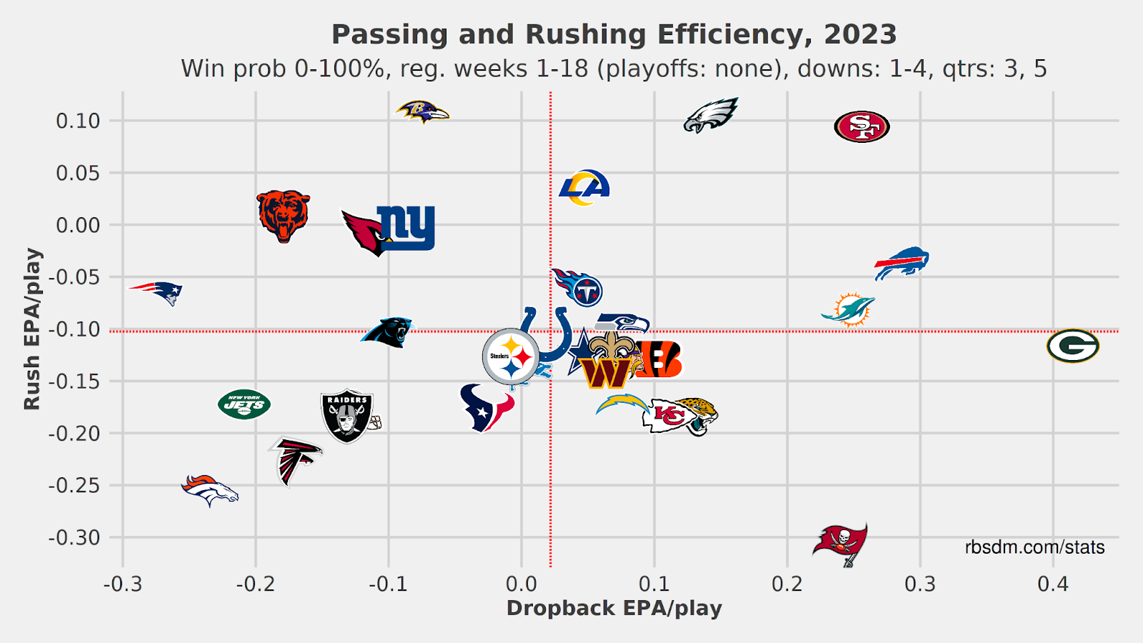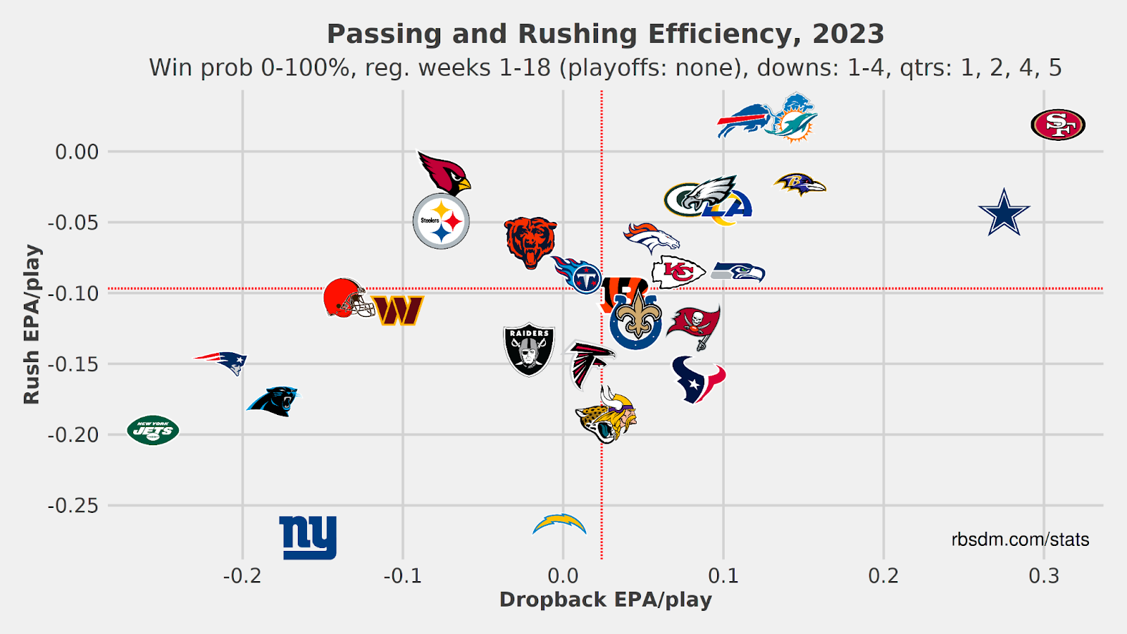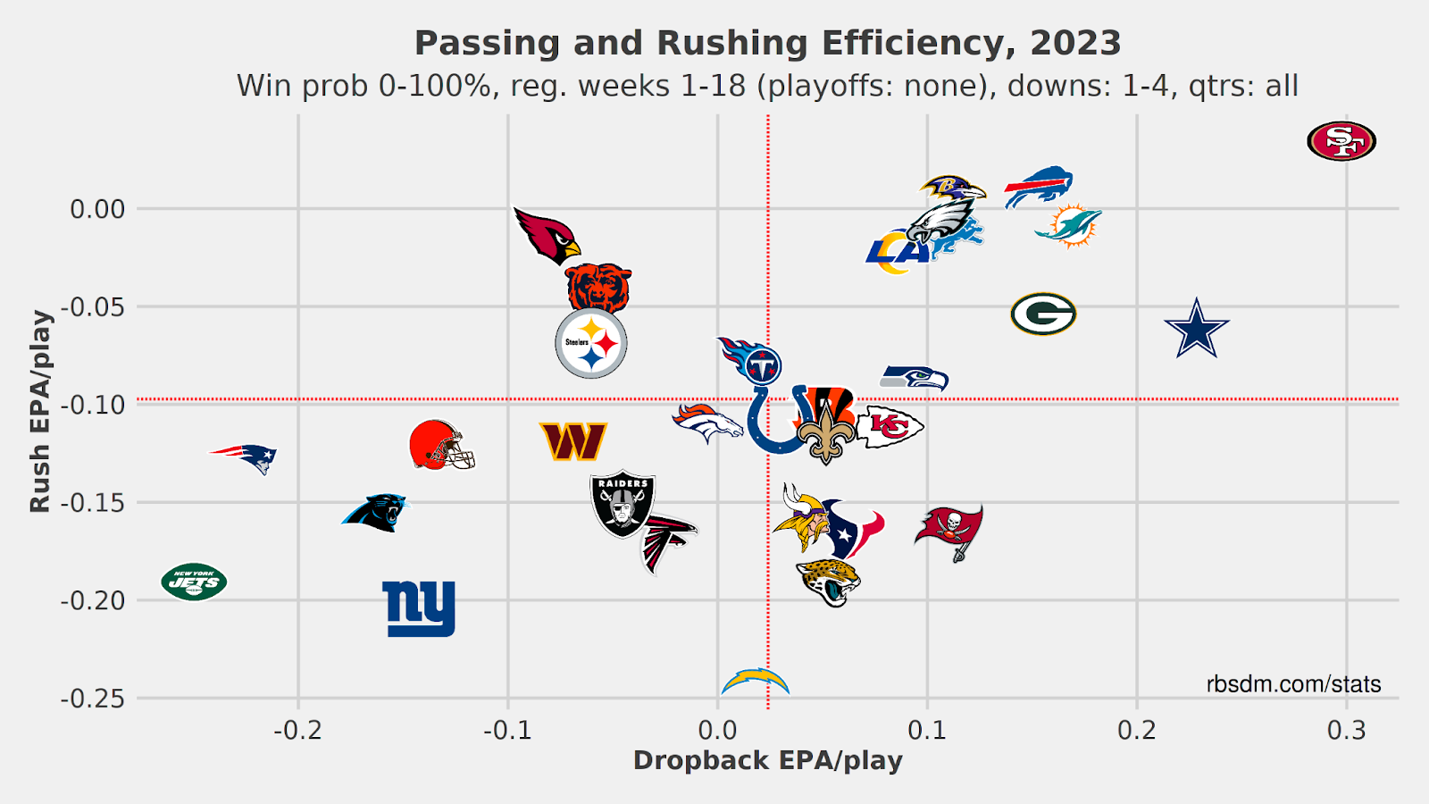 Offensively, the 2023 Detroit Lions were among the best. Due to the team’s stellar offensive line, talented running back pairing, and top-notch play-calling, the Lions finished the regular season fifth in EPA per rush, as can be seen in the y-axis of the data visualization below. The Lions were just as deadly in the passing game, finishing the regular season at seventh-highest in EPA per dropback.