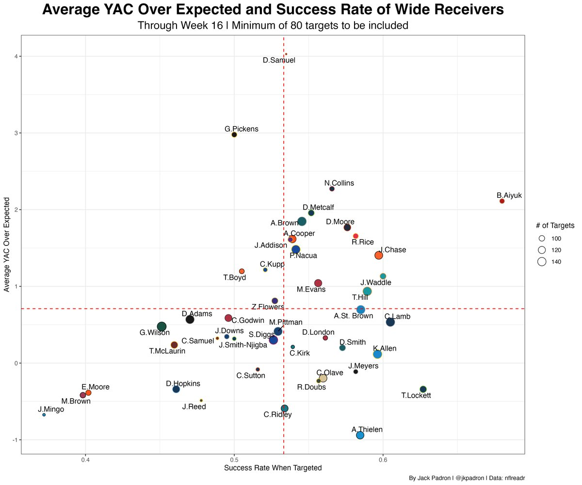 As the graph above shows, Amon Ra St. Brown doesn’t do too much more after the catch than what’s expected, but is incredibly successful when targeted. As a slot receiver, he catches nearly everything thrown his way and displays incredible discipline. In his three years with the team, St. Brown has amassed 315 catches for 3,588 yards and 22 total touchdowns–not bad for a former fourth-round selection.
