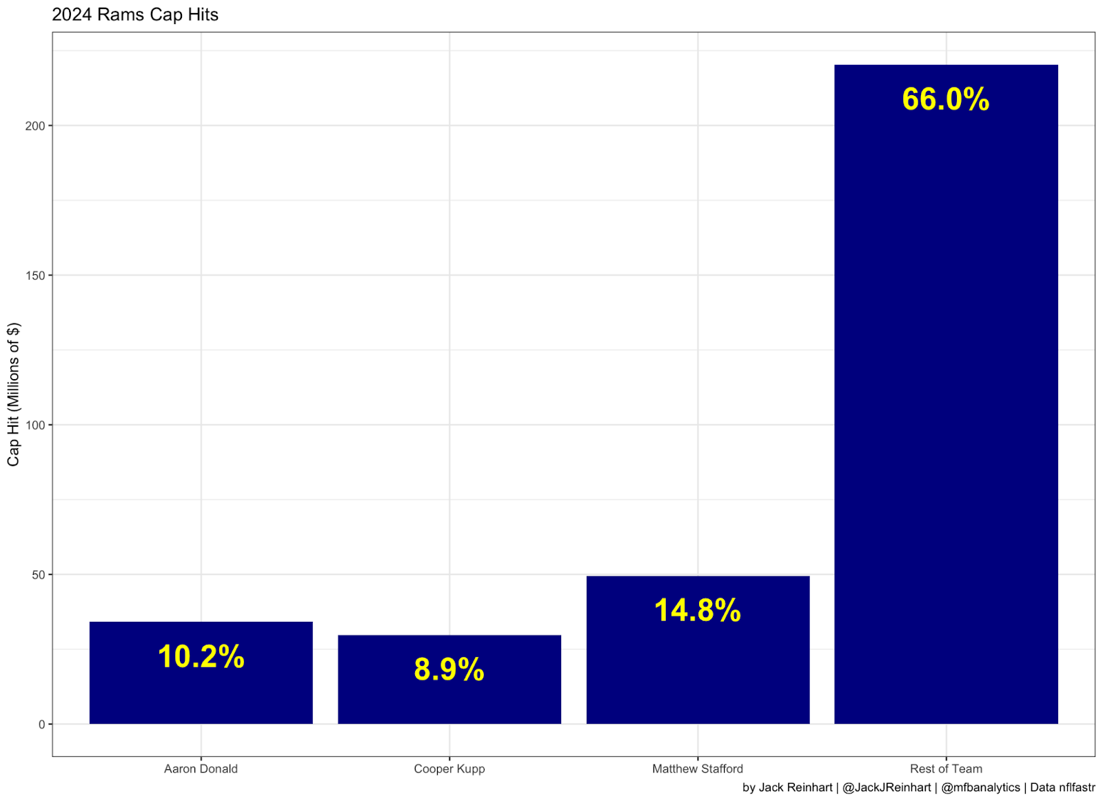 As mentioned before, Matthew Stafford, Aaron Donald, and Cooper Kupp are taking up a very large amount of the Rams’ salary cap. In fact, the three of them currently account for 34% of the team’s spending in 2024.