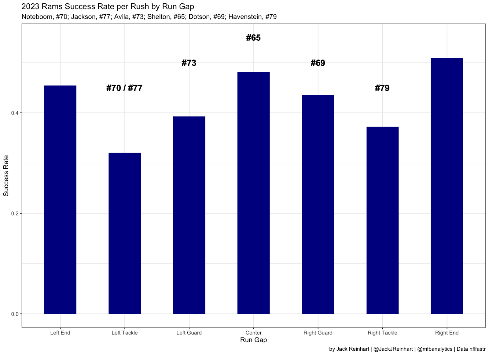 On the other side of the line from old standby Rob Havenstein, the Rams will likely look to find a ‘win-win’ resolution with left tackle Joe Noteboom, who had one of the worst years of his career. Noteboom, who only played 14 games in 2023 due to injury, has failed to play more than 10 games in three of his six seasons with the Rams. He is currently slated to eat up $20 million worth of cap space in 2024, leading the Rams into talks to hopefully restructure his deal in hopes of stretching out cap hits. Especially with solid performances by backup Alaric Jackson, Joe Noteboom will continue to cost the Rams heavily if he cannot stay healthy. The graph below shows the Rams’ success rate on run plays by run gap.